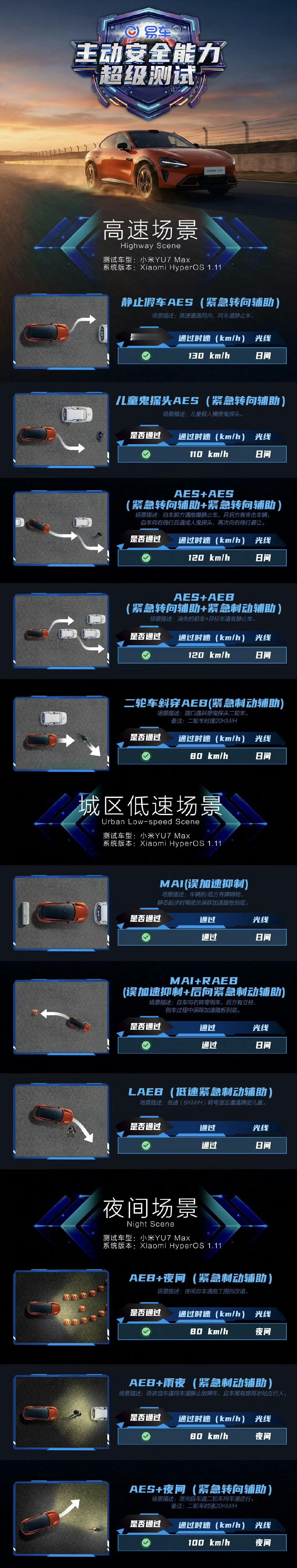 搭载了最新小米HAD增强版和安全辅助功能的小米YU7,在昨天易车「主动安全能力超级测试」中,通过了高速、城区、夜间三大场景的全部11项测试,整个测试全程直播,点击图片一起来看看AEB,AES和MAI,在实际测试中的表现如何?再次提醒大家辅助驾驶不是自动驾驶,驾驶仍需保持专注!
