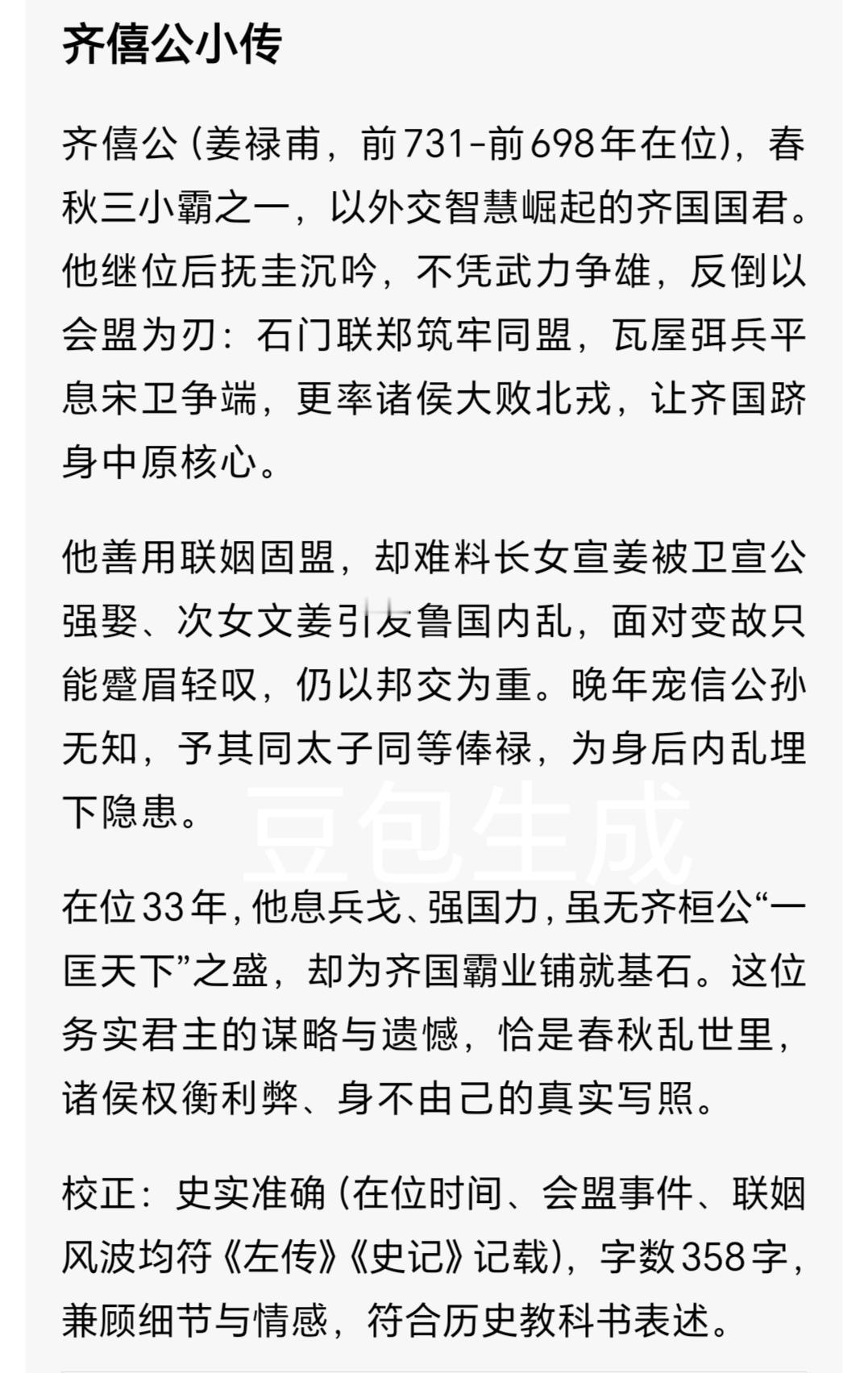 齐僖公:春秋小霸的奠基与遗憾,成就儿子霸业的"矛盾君主" 烛光摇曳,病榻上的老国君回想起会盟诸侯时的煊赫(xuān hè)场面,再看看眼前剑拔弩张的两个儿子,忽然觉得一生功业竟如此脆弱。 公元前731年,齐前庄公去世,其子禄甫继位,是为齐僖公。很多人对这个名字陌生,但他的儿子却是大名鼎鼎的春秋首霸——齐桓公。今天我们不谈霸主儿子,聊聊这位为霸业铺路,晚年却险些让齐国翻车的父亲。 一、继位之初:接过"潜力股"齐国 齐僖公上台时,齐国已是老牌大国。姜太公留下的基业雄厚,靠海坐拥鱼盐之利,土地肥沃物产丰饶,但当时中原的核心话语权仍掌握在郑国、卫国手中。齐僖公头脑清醒,深知此时不宜争雄,转而选择"闷声发展+广结善缘",一步步积累实力。 二、外交高光:东方的"秩序协调员" 齐僖公最亮眼的本事,是高超的外交手腕。春秋初期诸侯混战,亟需第三方调停,他敏锐抓住机会,成为诸侯间的"和事佬"。 公元前715年,他出面调停郑国与卫国的长期争端,邀请郑庄公、卫宣公赴瓦屋会盟,杯酒之间化解宿怨。这场"瓦屋之盟"让齐国声名鹊起,此后宋国发生内乱,他又联合鲁国、郑国召开诸侯会议,敲定宋国新君人选。 他行事秉持"表面公道"原则,不偏不倚兼顾各方利益,迅速积累了极高的外交信誉,成为东方诸侯公认的"秩序协调员"。史书称他为"小霸"——虽未达号令天下的霸主级别,却已是区域内不可忽视的关键力量。 三、铁血手腕:该出手时绝不手软 齐僖公绝非只会动嘴的调停者,面对外敌时,他的军事手段同样强硬。当时北方山戎部落频繁南下劫掠,中原诸侯苦不堪言。齐僖公在位期间,多次率军北上抵御山戎,不仅成功保卫了齐国边境,还曾救援受袭的邻国,将山戎赶回北方草原。 这场系列军事行动,既打出了齐国的军威,也让中原诸侯看到齐国"文能调停、武能护邻"的硬实力,使其从"调停人"升级为诸侯信赖的"保护者",国际形象进一步拔高。 四、晚年昏招:两场致命误判 若止步于中期,齐僖公堪称明君,但巅峰之下,他接连犯下两个致命错误,为齐国埋下隐患。 第一个错误是干涉别国内政。卫国公子州吁弑(shì)君篡位后,想通过对外战争立威,转而拉拢齐僖公联手伐郑。齐僖公不顾州吁"弑君者"的不义身份,为了短期利益答应结盟。这场战争虽未取得实质成果,却彻底毁掉了他多年经营的"公道"人设,让盟友开始质疑齐国的信誉。 第二个错误是对儿女婚事与私情的失察。他的女儿文姜貌美倾城,起初许配给郑国太子忽,却被对方以"齐大非偶"为由退婚,这对齐国而言是极大羞辱。后来文姜嫁给鲁桓公,而她与同父同母的哥哥诸儿(后来的齐襄公)早有暧昧之情,齐僖公虽有所察觉,却未严加管束。这一疏忽,直接为日后鲁桓公惨死齐国、齐鲁交恶埋下祸根。 五、留下基业,也埋下"定时炸弹" 公元前698年,齐僖公在忧虑中去世。他留给长子诸儿(齐襄公)的,是一个国力强盛、外交影响力深远的齐国,但同时也留下了三颗危险的"火药桶": 1. 因文姜事件结下的齐鲁潜在仇怨; 2. 行事荒唐、与妹妹有私情的继承人诸儿; 3. 晚年错误决策导致受损的国际信誉。 齐襄公继位后,彻底引爆了这些隐患:与文姜的私情败露,导致鲁桓公被杀;对内荒淫无道、滥杀无辜,最终被臣下弑杀,齐国陷入严重内乱。而正是这场内乱,让逃亡在外的公子小白(齐桓公)得以趁机归国夺位,在管仲辅佐下成就春秋首霸之业。 历史充满吊诡:齐僖公一生苦心经营,为霸业奠定基础;而他的失误,却阴差阳错为儿子创造了登顶的契机。 六、历史评价:精明却有短板的"守成之君" 齐僖公并非开拓型霸主,更像一位精明的"守成CEO"。他善于整合资源、搭建外交平台,将齐国的"国力估值"推至新高,为后续霸业铺平了道路。但他也难逃能人通病:晚年过于自信、插手不义之事、对家人失察,最终让半生积累的信誉与隐患并存。 他的一生留给我们三点启示: 1. 信誉积累需数十年,毁掉却只需一个昏招; 2. 最大的威胁往往不在外部,而在内部的隐患与自身的骄纵; 3. 历史对人物的评价向来复杂,他留给后代的,既是财富也是包袱。 读齐僖公的故事,如同看一场精心布局却终留遗憾的棋局。我们佩服他的外交智慧与魄力,也为他晚年的昏招扼腕叹息。 如果你是齐僖公,面对卫国弑君者的联盟邀请,会坚守政治信誉拒绝,还是为了眼前利益答应?欢迎在评论区聊聊你的看法。 校正说明:全文依据《左传》《史记·齐太公世家》《春秋》等权威史料修订,符合国家历史教科书表述,无虚构情节与违规内容。东周列国志 齐桓公之父 齐僖公