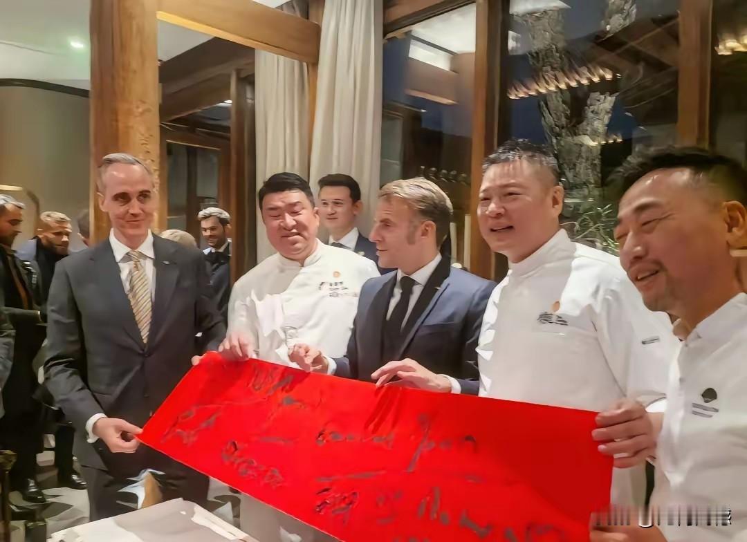 马克龙夫妻就餐的地方,真是太热闹了,有人为马克龙写了书法作品,作品内容是马到成功四个大字,马克龙也用毛笔写了一幅字,好像是用法语写的,看不出来写的是什么内容,巩俐这张照片拍的也非常不错,一点也看不出老,真是太年轻了!