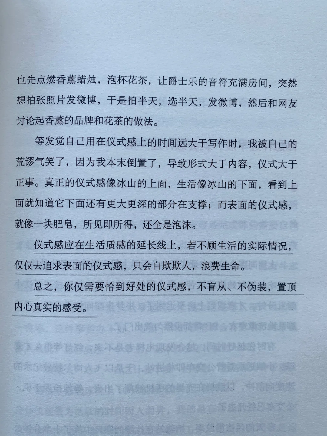 仪式感应在生活质感的延长线上,若不顾生活的实际情况,仅仅去追求表面的仪式感,只会自欺欺人,浪费生命。总之,你仅需要恰到好处的仪式感,不盲从、不伪装,置顶内心真实的感受。
