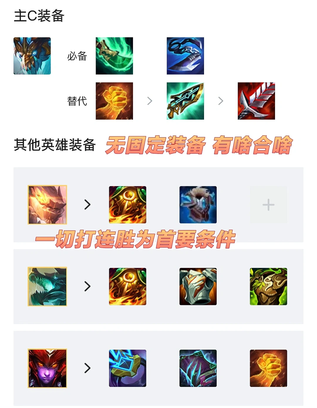 [开箱R]装备思路:装备方面不用刻意给谁做装备。一切以连胜和核心,不留装备,除了分裂机这种装备实在处理不了其他都是有就合保血量打连胜。