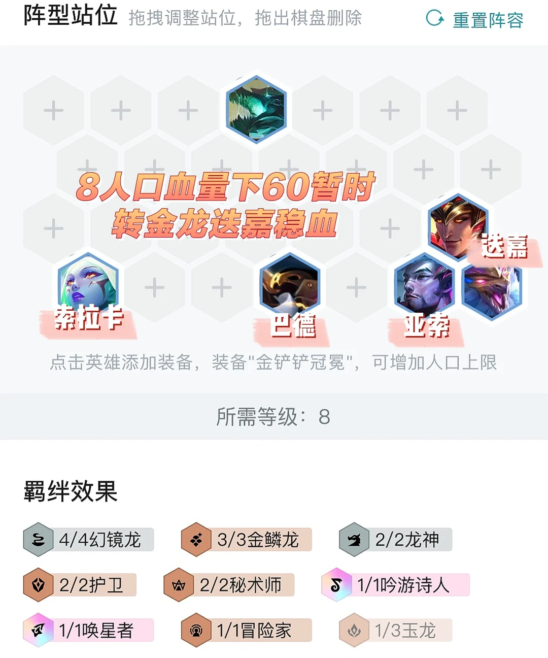 如果自然上8的过程中血量掉到60以下了,这时候就需要提升以下场上的质量,大约是4-5到5-1这个时间节点之间先抽出二星金龙和迭嘉稳血。