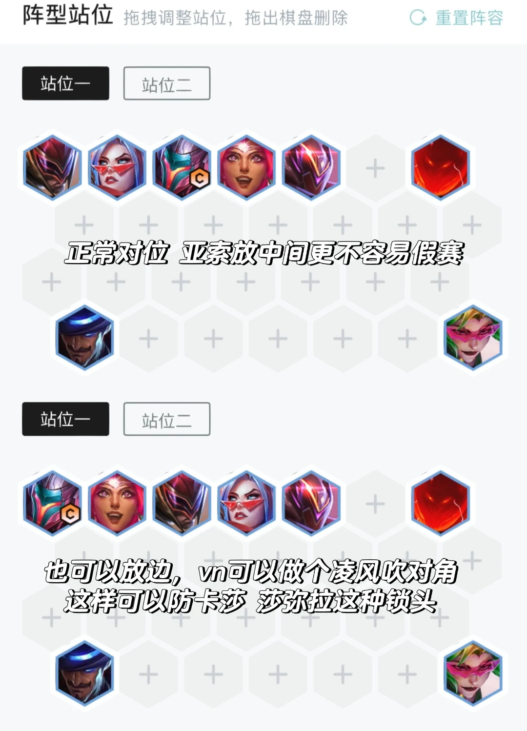 正常亚索中间更不容易假赛,也可以放边,如果有天胡卡莎,高枪手莎弥拉这种可以VN带灵风吹对角防锁头。