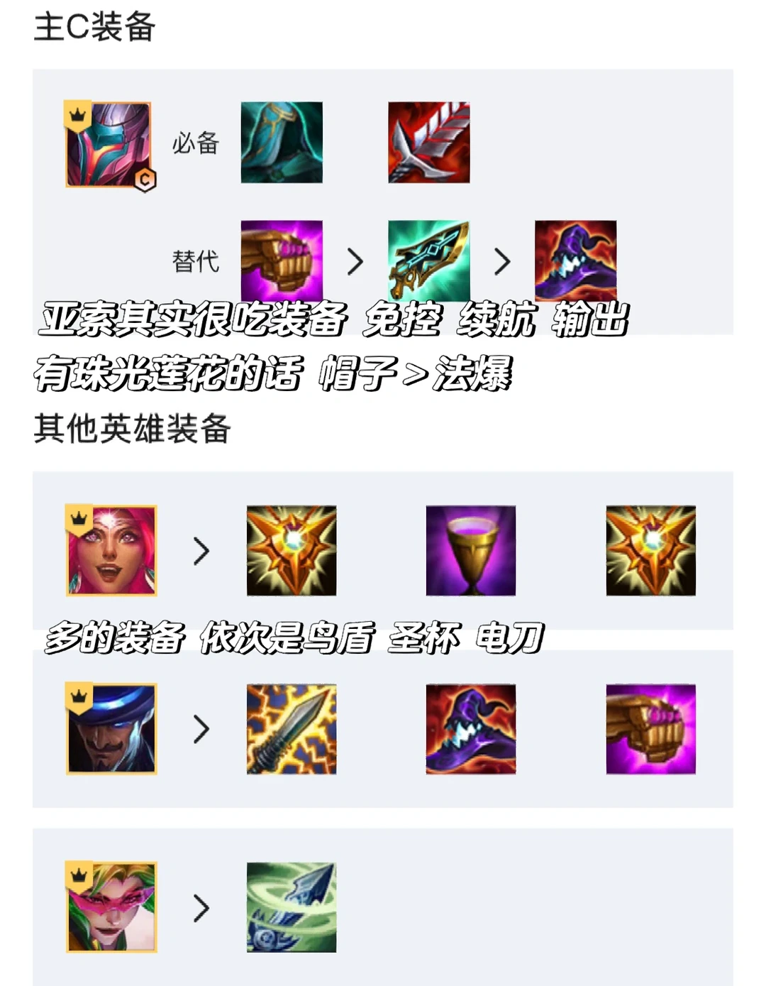 [氛围感R]装备思路:亚索核心免控+续航+输出法装,有珠光帽子是>法爆的。
