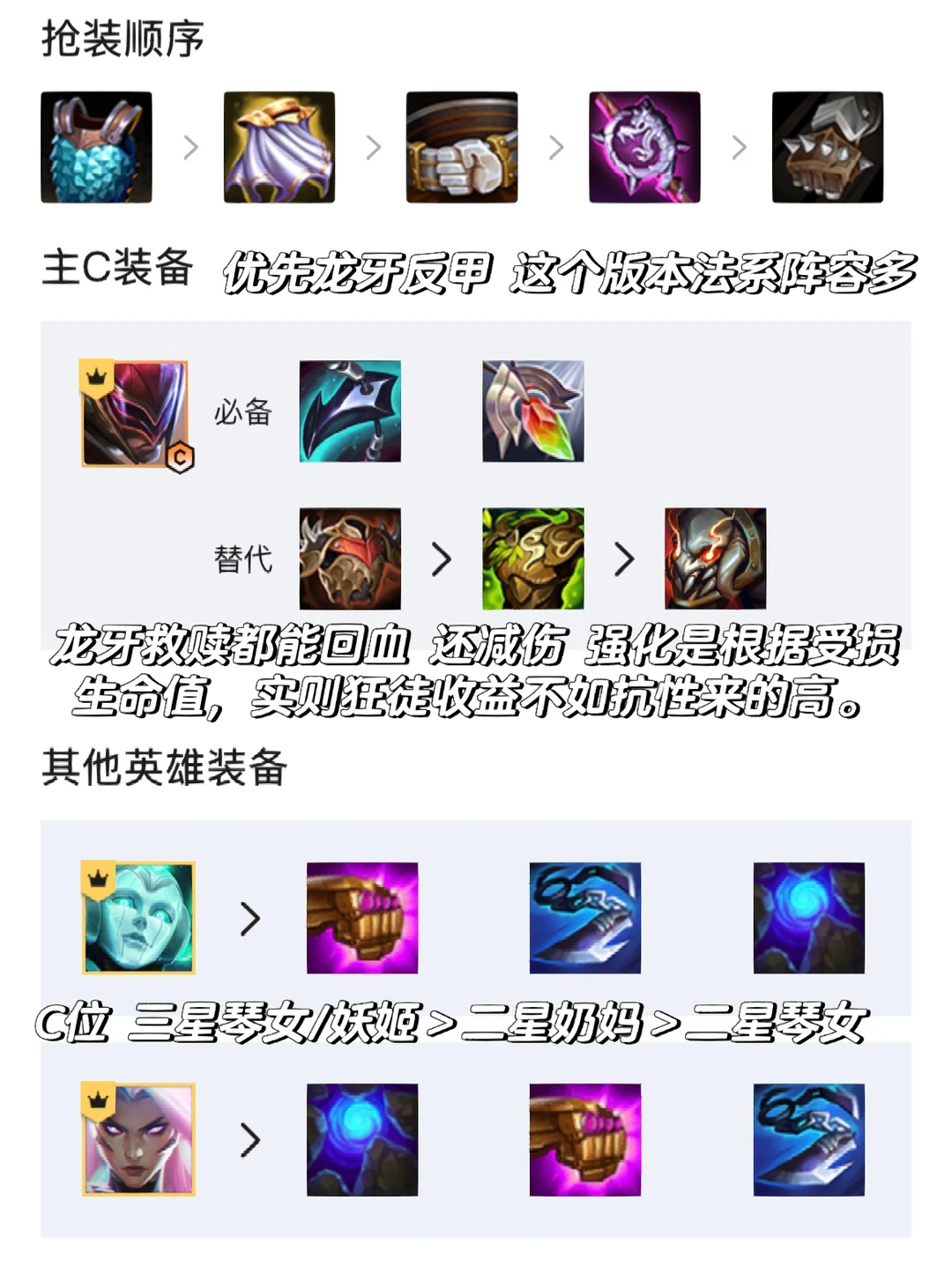 [氛围感R]装备思路:先给李青找装备,反甲龙牙标配,第三件救赎可以减伤回血,泰坦狂徒也相当不错,龙牙这个版本很强,我看直播都喜欢先做龙牙能回血,而且基本都是法师,物理阵容不多。