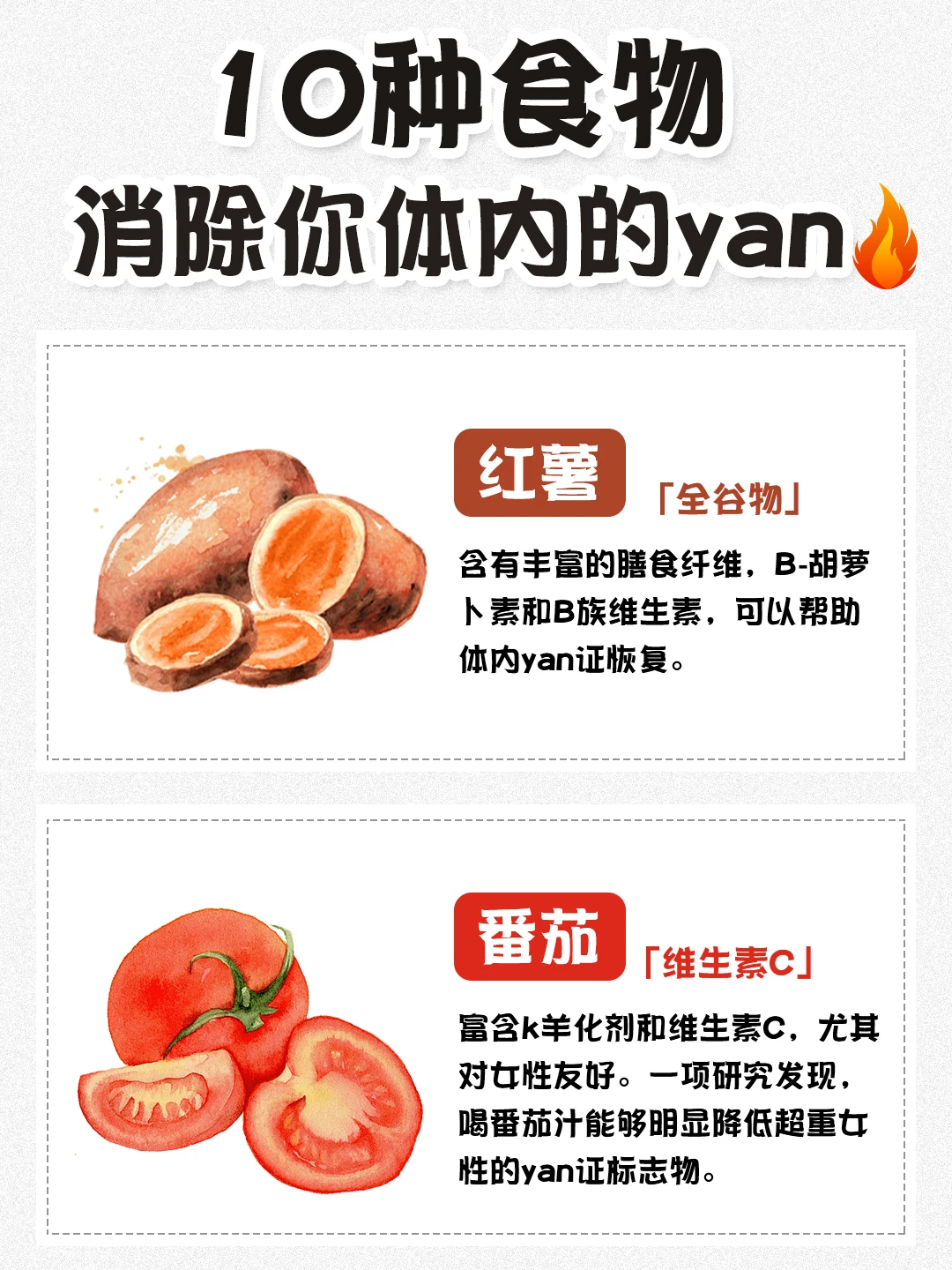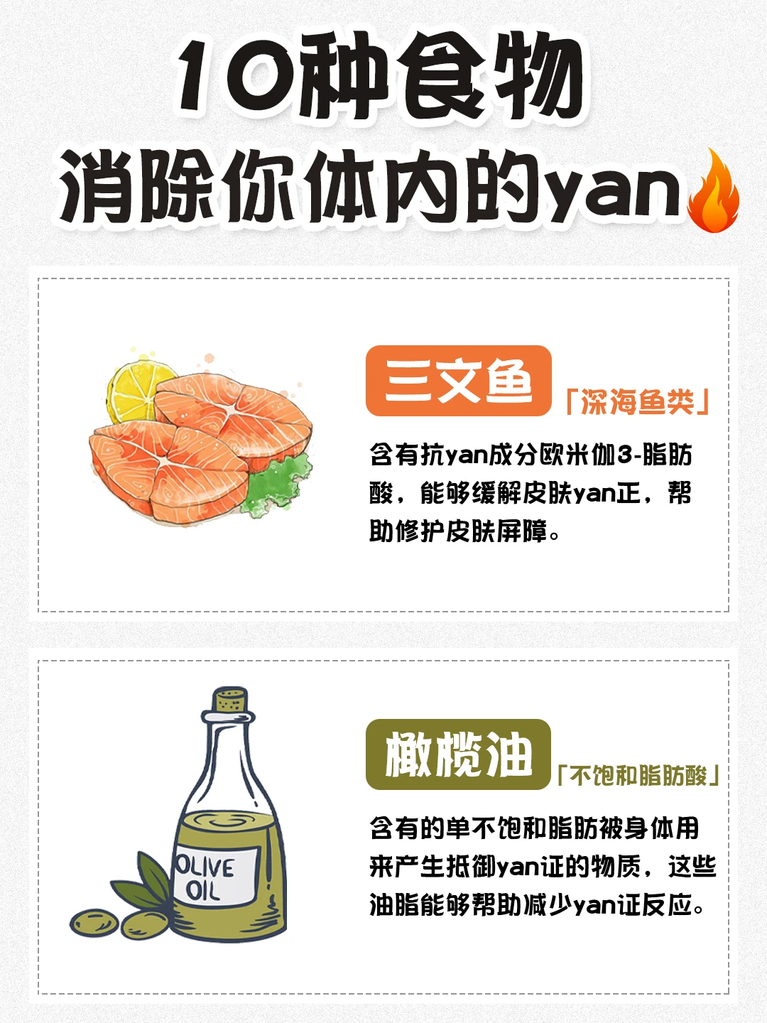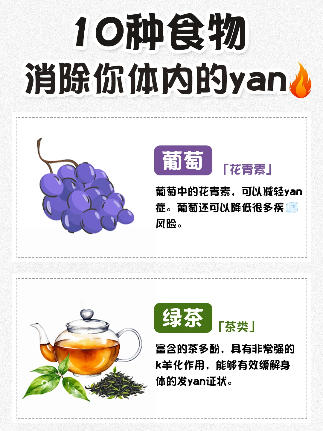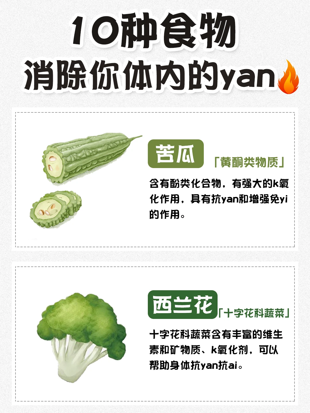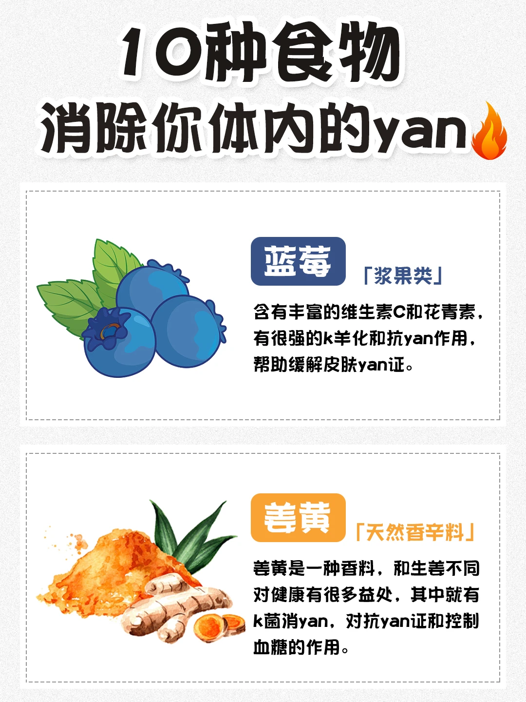 今天给大家分享10消除体内yan症的食物,让我们从饮食开始,养好肤先抗火火♨️ 1️⃣蓝莓 2️⃣姜黄 3️⃣苦瓜 4️⃣西兰花 5️⃣红薯 6️⃣番茄 7️⃣葡萄 8️⃣绿茶 9️⃣三文鱼 🔟橄榄油