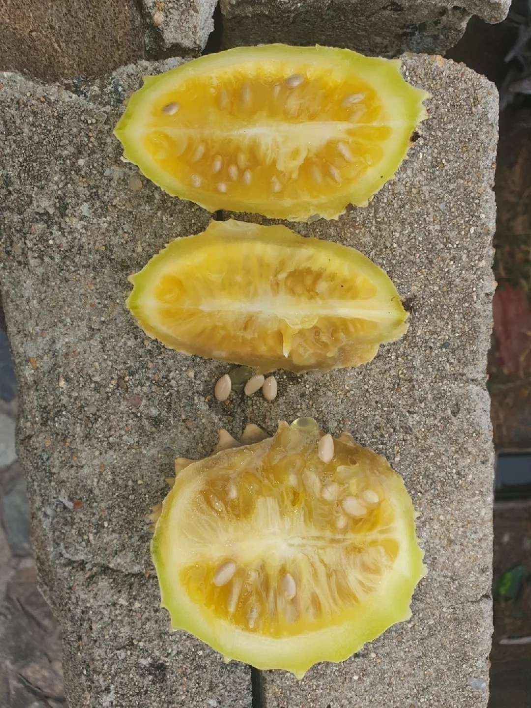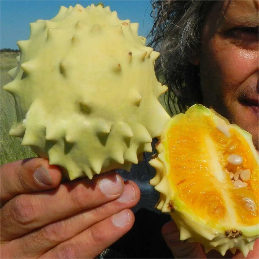 刺猬一样的“大羚羊黄瓜”(Acanthosicyos naudinianus)葫芦科 产地:纳米比亚 它的果实大小约4-12厘米,一身长满了如许多黄瓜也带的果刺,不过它的果刺显得钝而短。和许多果实一样,未成熟的果实为绿色,但随着时间推荐,会逐渐变成黄色。果肉也为黄色,质地也几乎与黄瓜一样,多汁而富含着许多小小的种子。不过,食用它一定得辨别其生熟,不然吃到生的果实会在口腔中产生灼热感。 它是一种多年生草本植物,从1米长的块状砧木中产生长达6米的一年生茎。生产出一种美丽的水果,果壳可以作为装饰品。