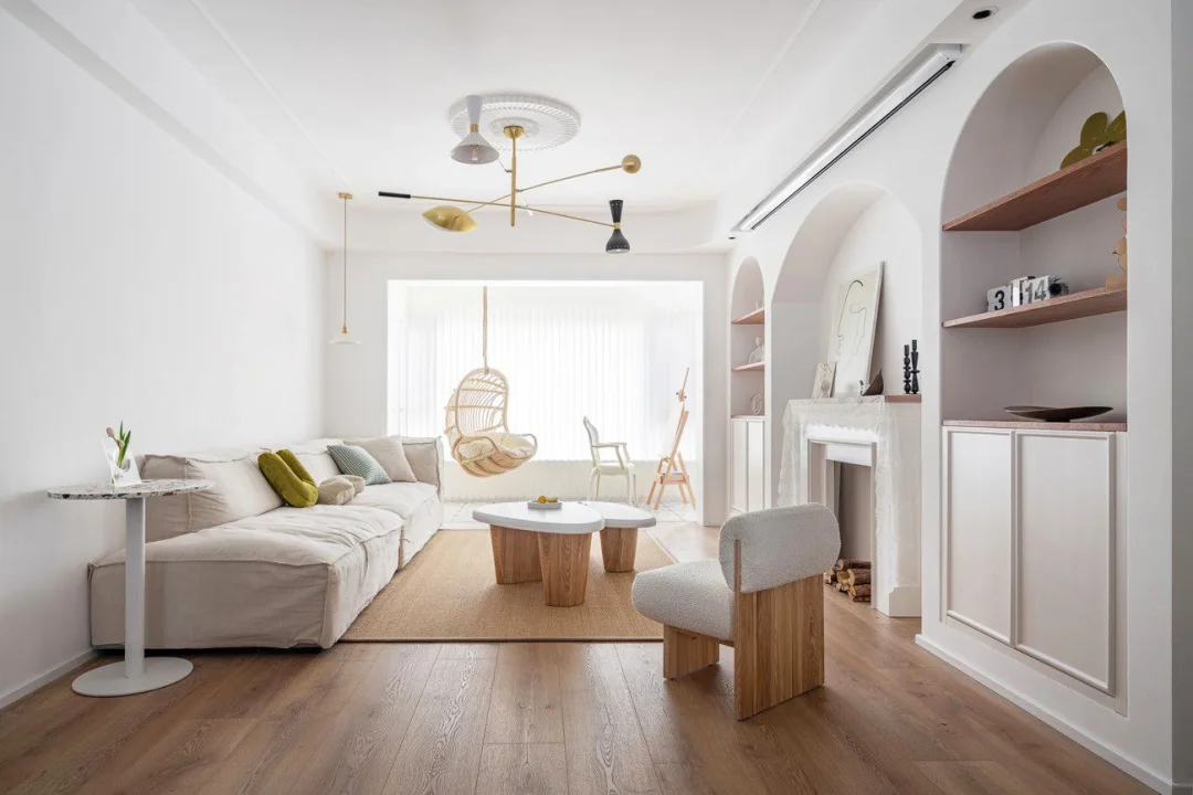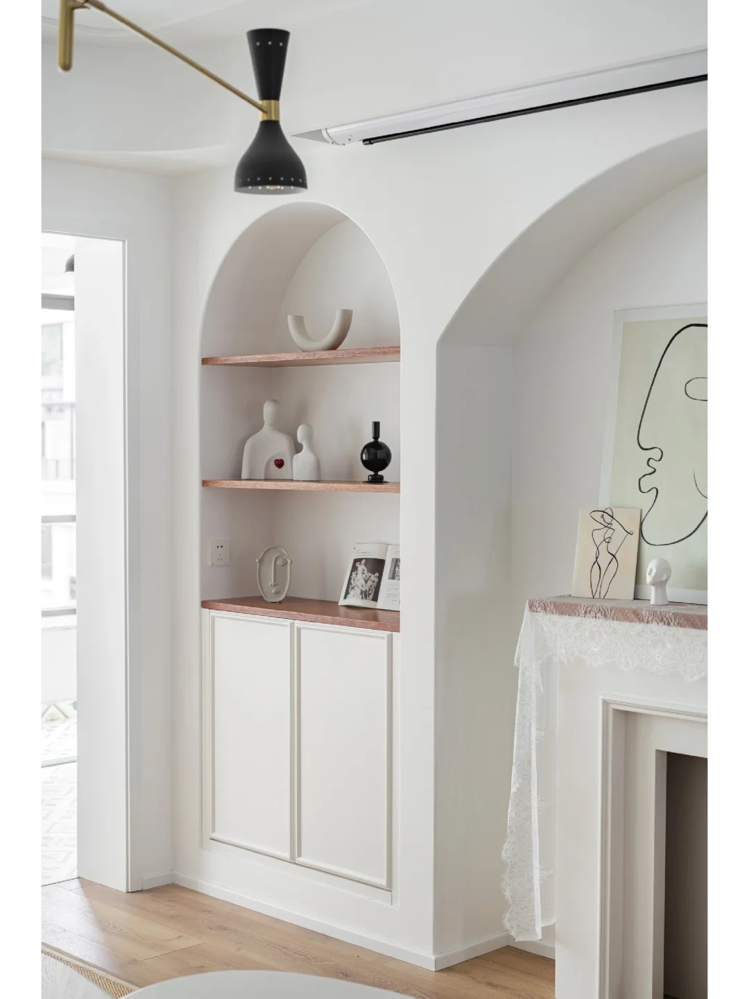 💎电视背景墙做了拱形墙面的设计,舍去了电视的空间做了壁炉,简约大气。纯色沙发背景墙不做一丝装修设计,搭配上柔软的科技布沙发,温暖柔和,又不缺乏质感,久居于此,人的内心也能得到安宁的自然与治愈。
