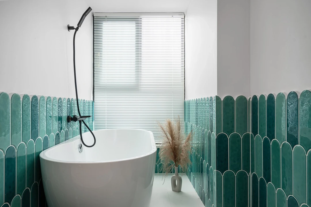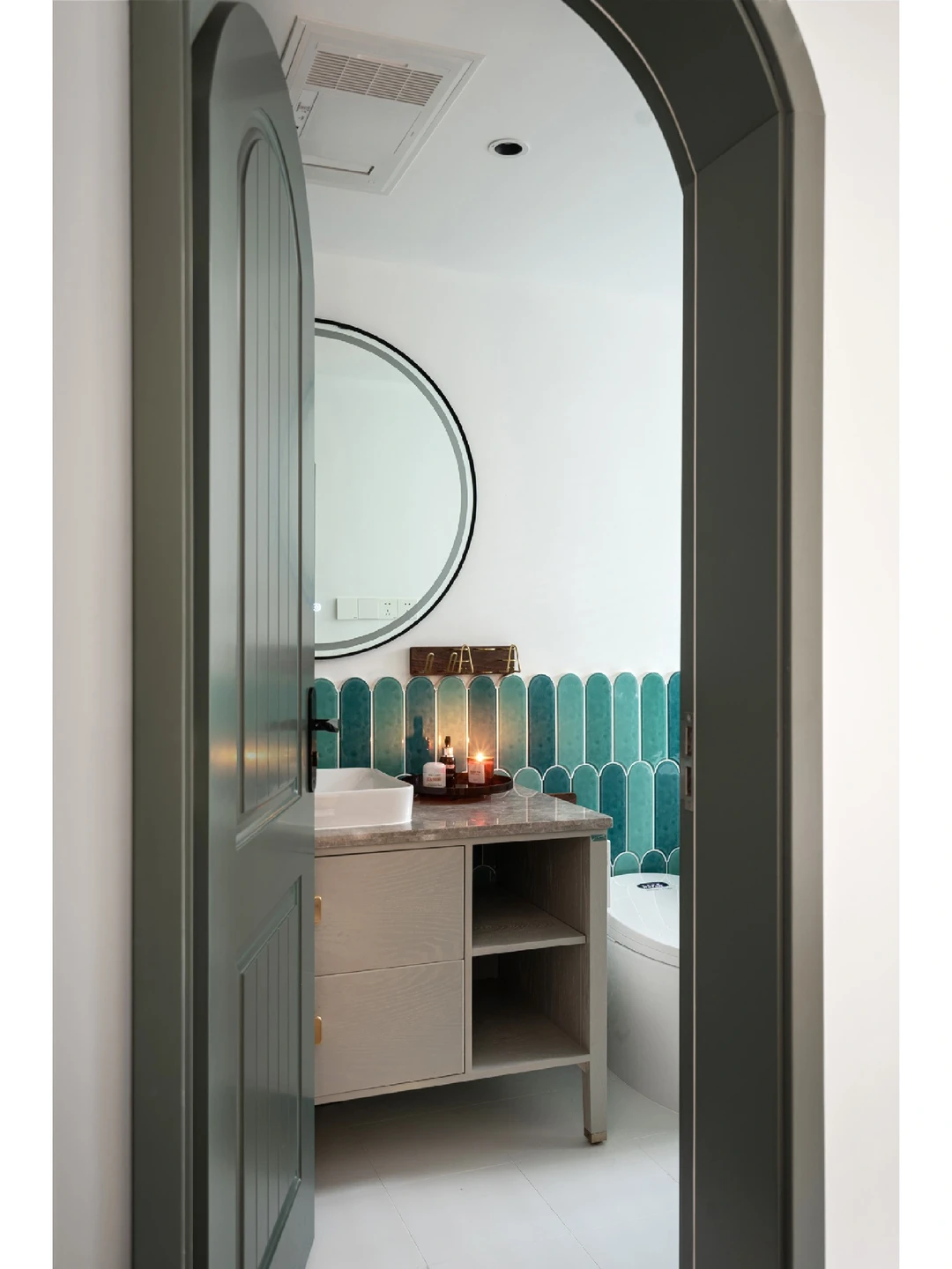 💎纯白的空间内平铺了色调不一的绿色瓷砖,整个环境更加富有生气。还有一个大大的浴缸放置到了光线最好的床边,泡个澡简直不要太舒服~