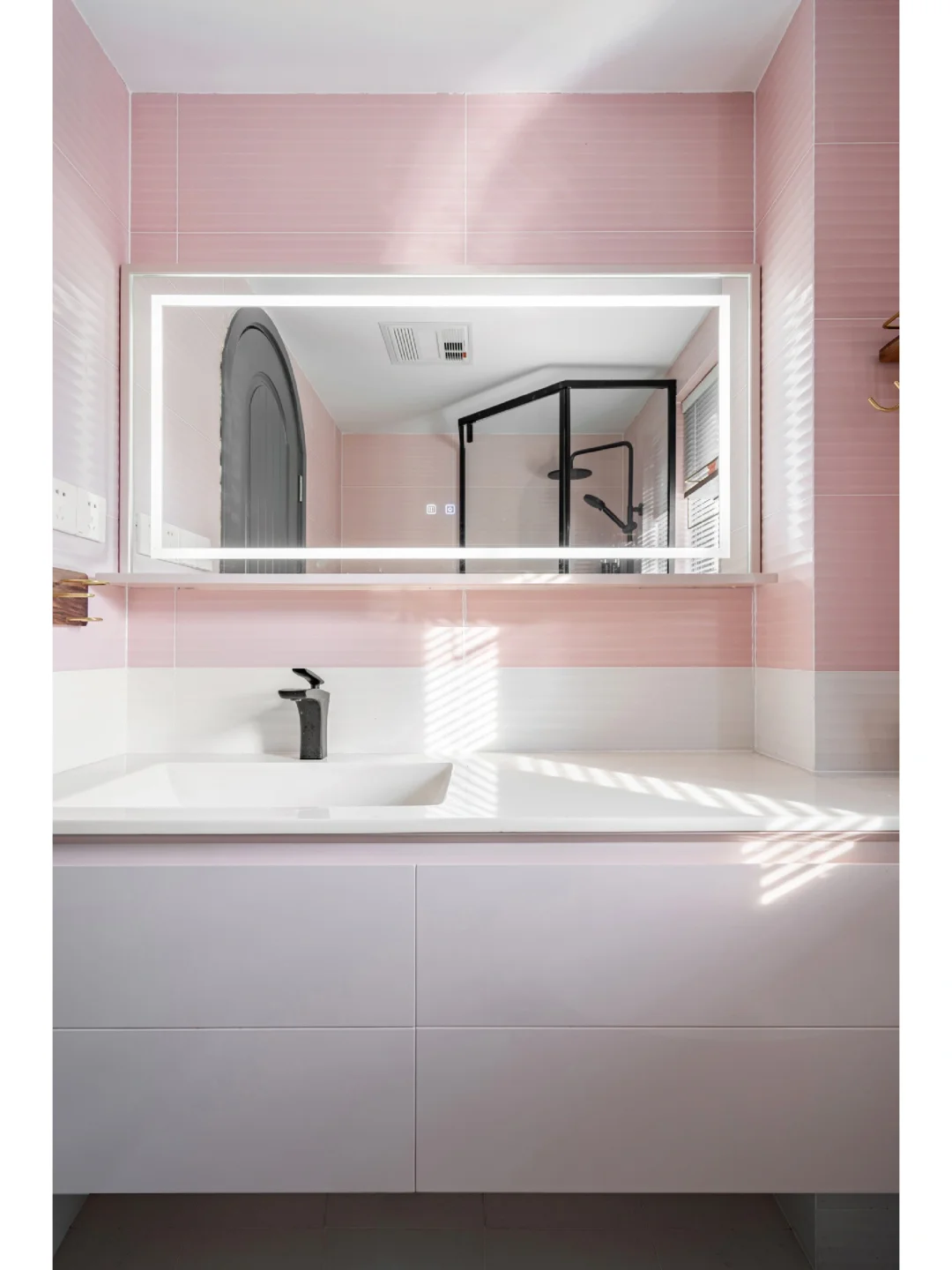 💎主卫相较于整个空间的纯白洁净,选择了柔软的粉色来营造氛围,暖和平稳。