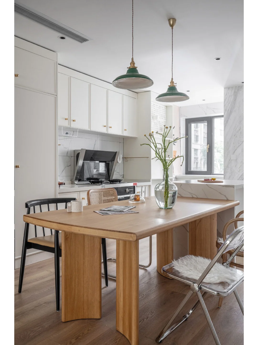 💎餐厅紧邻客厅而立,采用实木餐桌+岩板岛台的高低差设计,开放式的厨房让空间变得更通透明亮。除了台面上有电器摆放的位置,还做了内嵌的柜子收纳电器,让厨房变得更整洁明亮。因为跟墙面统一齐平的设计,不会有任何的突兀感也让整体变得更简洁。