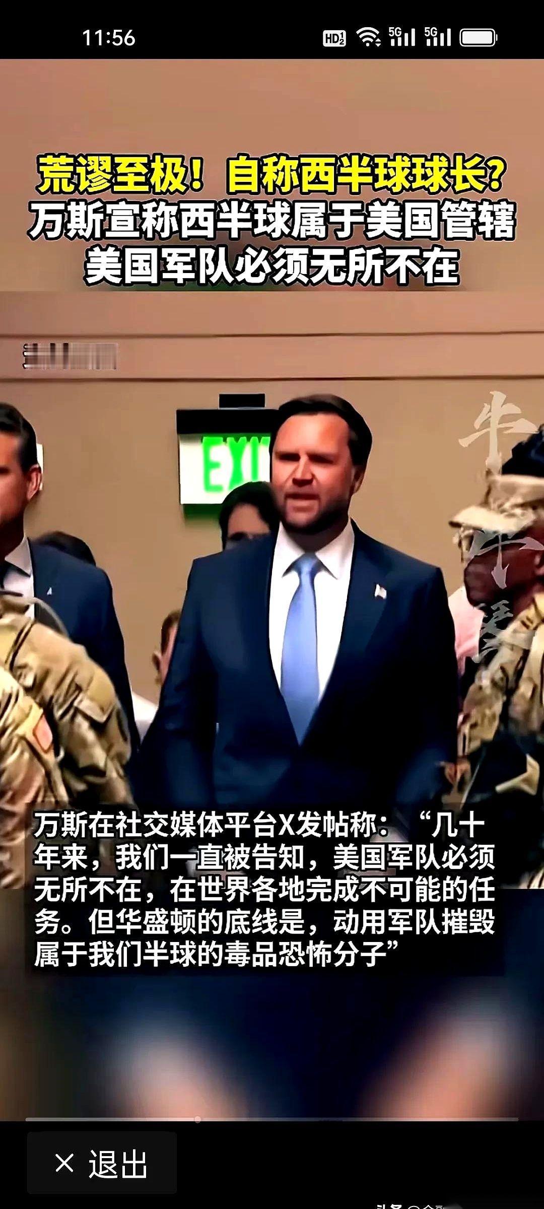 这哥们儿,万斯,真把我给整不会了。 就因为他妈当年深受毒品之害,他现在要开着航母去扫荡整个西半球的毒贩。 你没听错,整个西半球。他说,那片儿,归美国管。 这口气,不知道的还以为是哪个帮派大佬在划分地盘。 私仇,用国运来报。这格局,是真大,还是真吓人? 我看到这儿,第一反应就是,这人心里得有多大的一个窟窿,才需要用整个半球来填。 有人说他这是在呼应特朗普的“G2”,西半球归你,那东半球呢? 呵呵,这问题,问得就有点多余了。 你自己看看这几十年,咱们闷头干了多少事儿。有些牌,早就握在手里了,只是我们不习惯像他那样,咋咋呼呼地甩在桌上而已。 我们信的是,把自己的家拾掇干净,路修平了,朋友自然就来了。而不是拿着大棒,去别人家院子里指手画脚。 挺有意思的。 一个人的伤痛,能催生出这么大的野心。 一个国家的崛起,靠的却是无数人默默的咬牙和坚持。 不过话说回来,他这支持率据说还不如特朗普的大儿子,戏有点多。