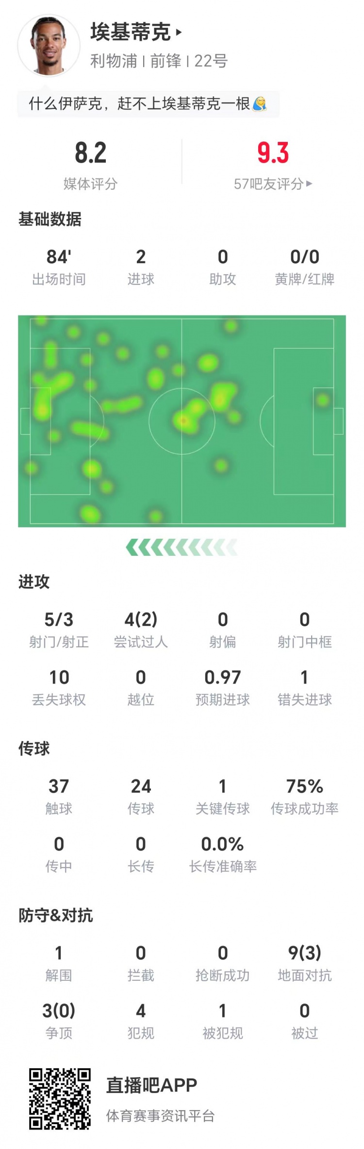 技术统计数据显示,埃基蒂克本场比赛5射3正打进两球,4次过人两次成功,1次错失进球,1次关键传球,获评8.2分。