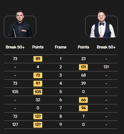 马克·塞尔比打出两杆破百(105、127)和三杆50+(73、73、72),肖恩·墨菲打出一杆破百(131),上半场过后塞尔比3-1领先墨菲,最终马克·塞尔比6-3战胜肖恩·墨菲,晋级决赛。