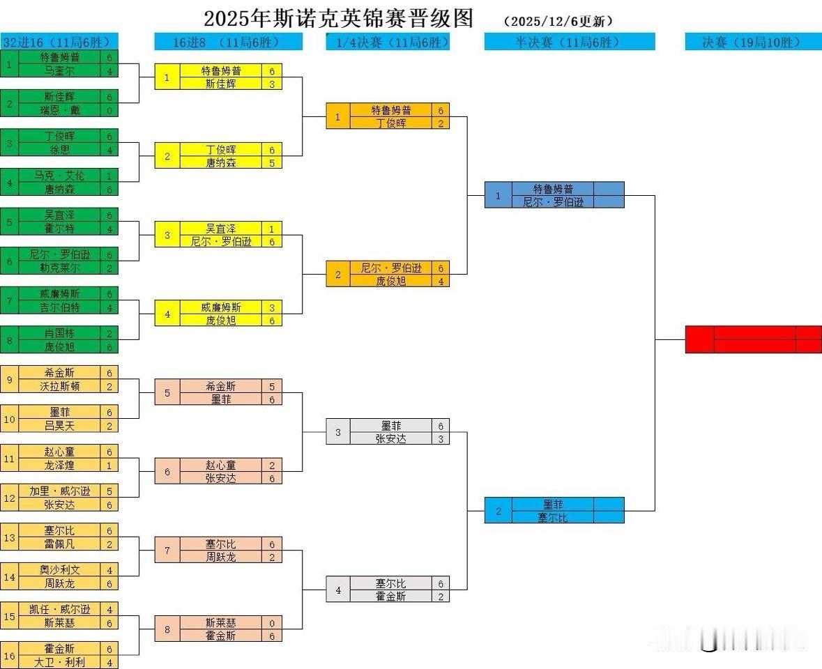 2025年斯诺克英锦赛太精彩了!北京时间12月7日早,两场半决赛结束,特鲁姆普和塞尔比分别6-3淘汰罗伯逊和墨菲,会师决赛争夺超235万奖金。 特鲁姆普和罗伯逊这场,堪称强强对决,两人都是世界冠军和大满贯球员,排名也都很靠前。上半场打得难解难分,2-2平。下半场特鲁姆普状态火热,连续四杆50+,6-3击败罗伯逊。 另一边,塞尔比也顺利淘汰墨菲。特鲁姆普和塞尔比都是英锦赛冠军得主,这场巅峰对决,谁能夺冠实在让人期待! 斯诺克赛程 斯诺克决赛
