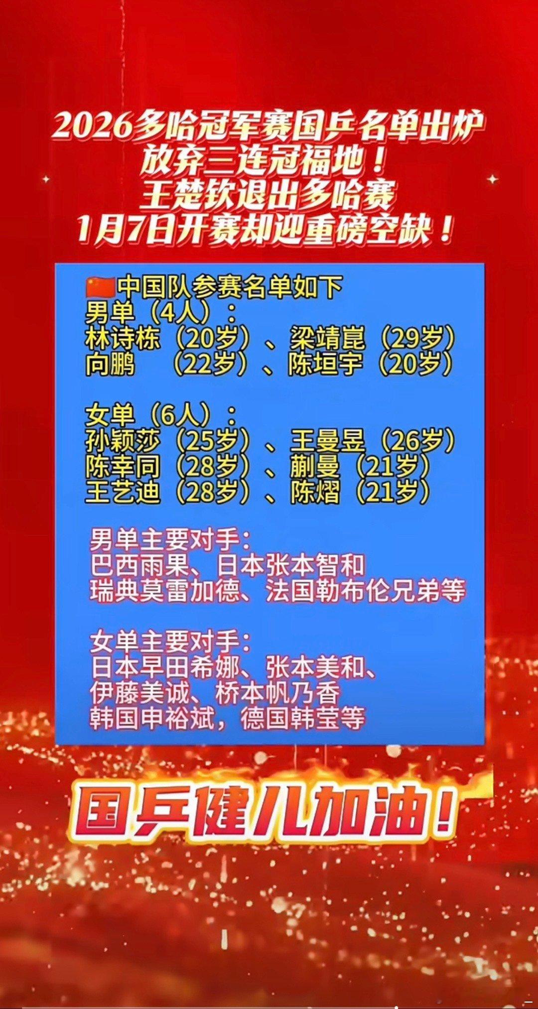 一到六点半,国乒众神就不演了,之前莎莎和大胖对练,楚钦和小袁对练。名单一出