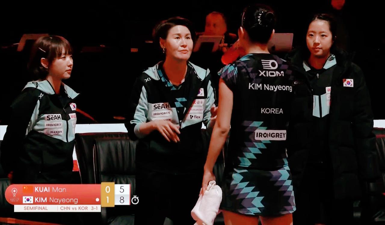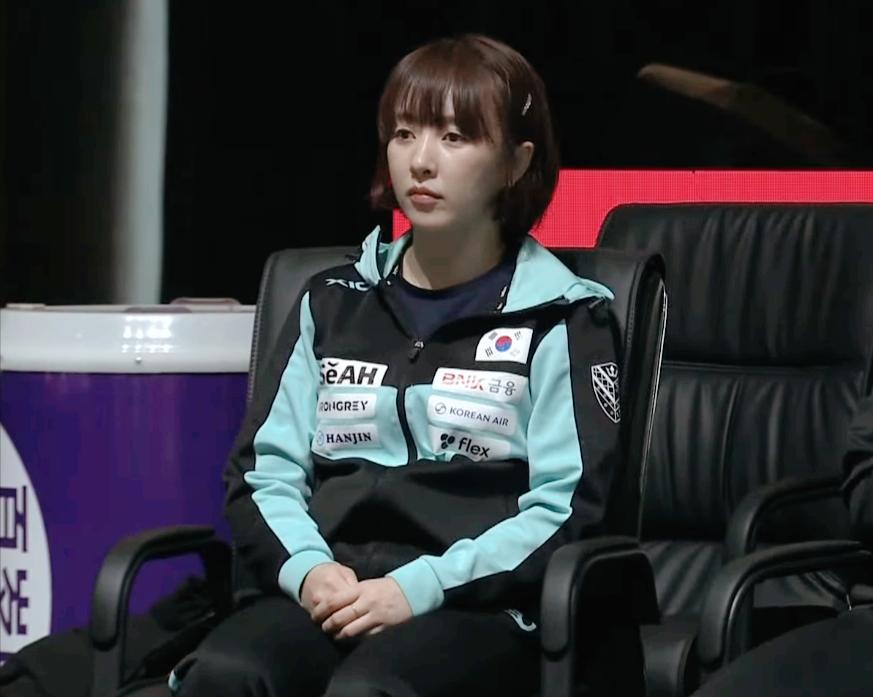 小曼姐厉害了! 从1:5地狱般开局, 到3:8落后, 结果连追8球, 11:8逆转了,哈哈 这一局有个靓点, 不,是三个靓点, 金娜英叫暂停的时候, 韩国队的金娜英,申裕斌,李孝元同时出镜了, 不得不说, 太养眼了!