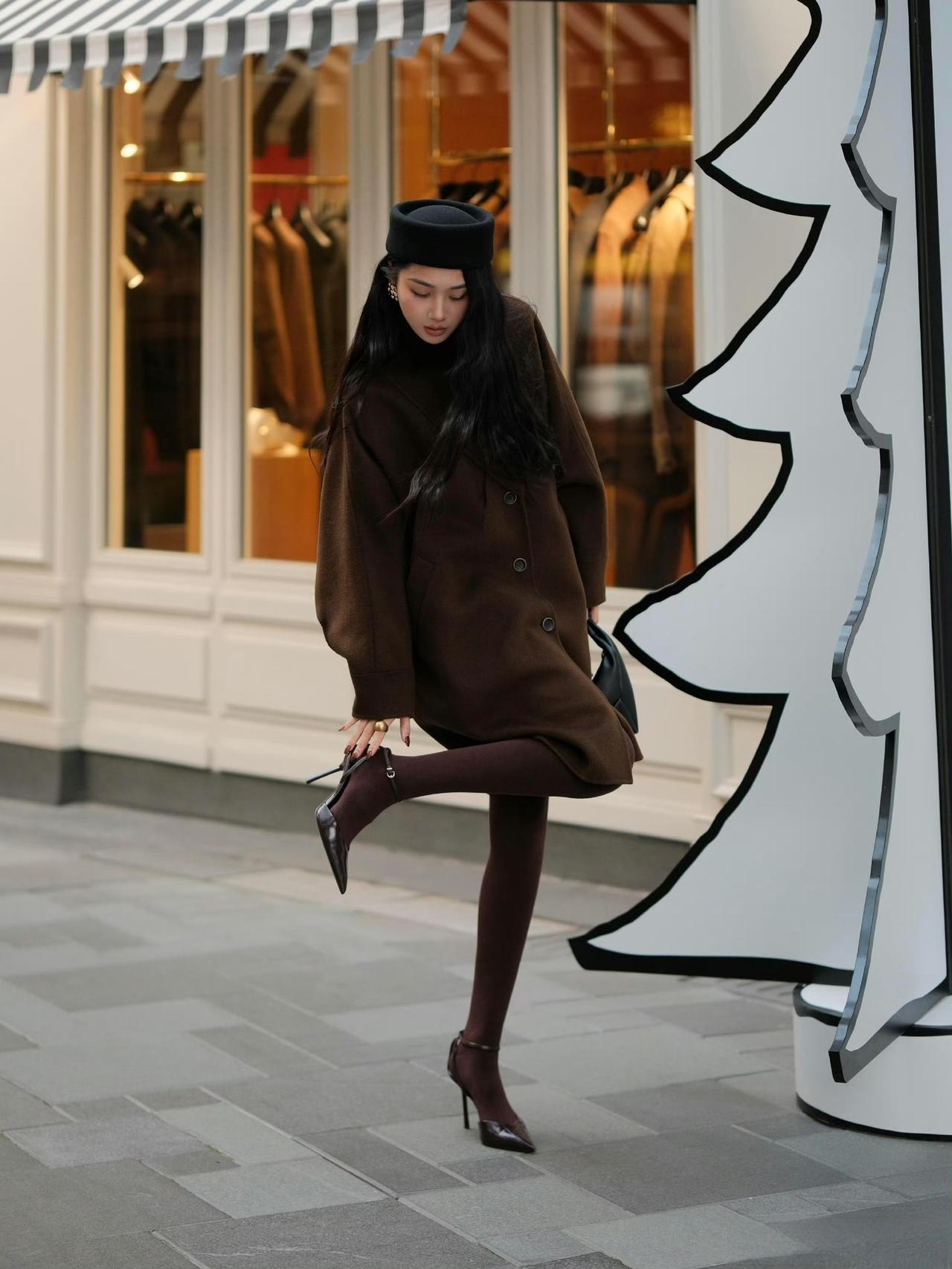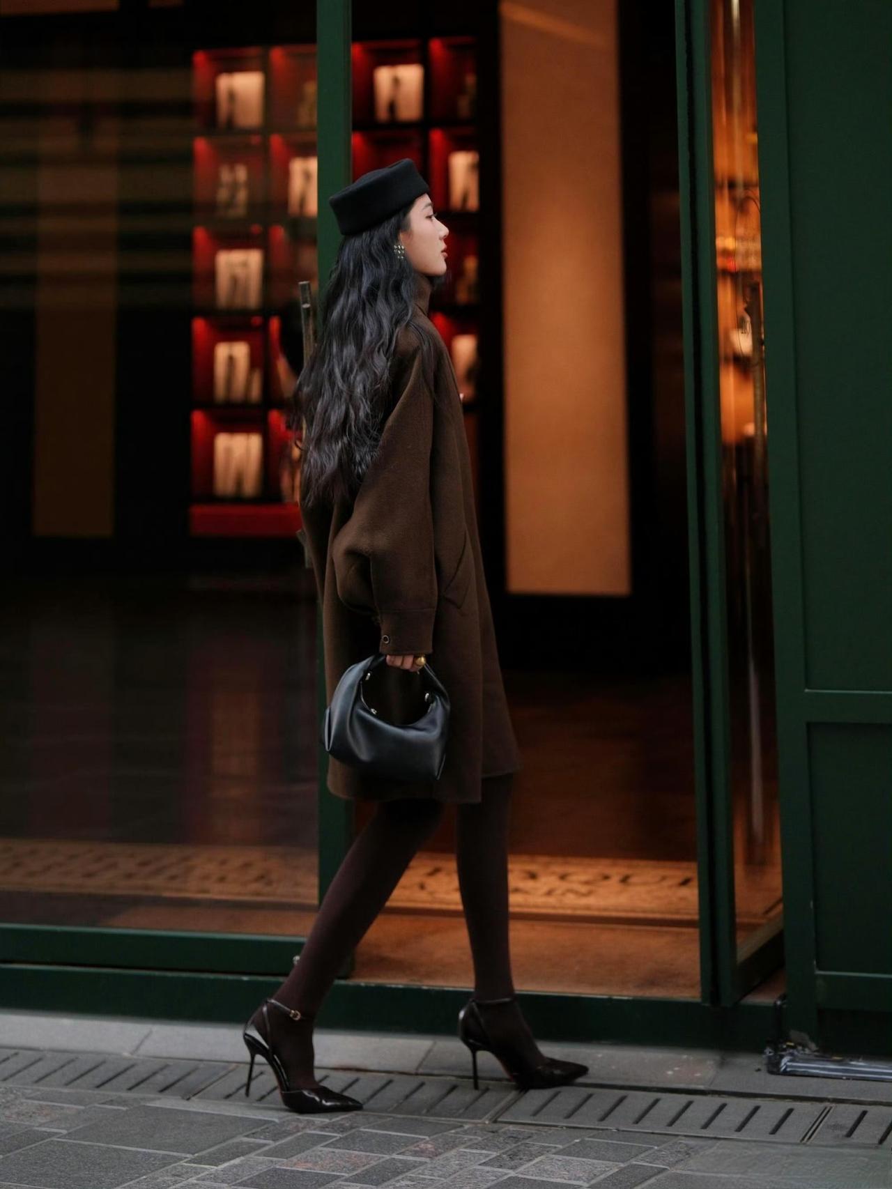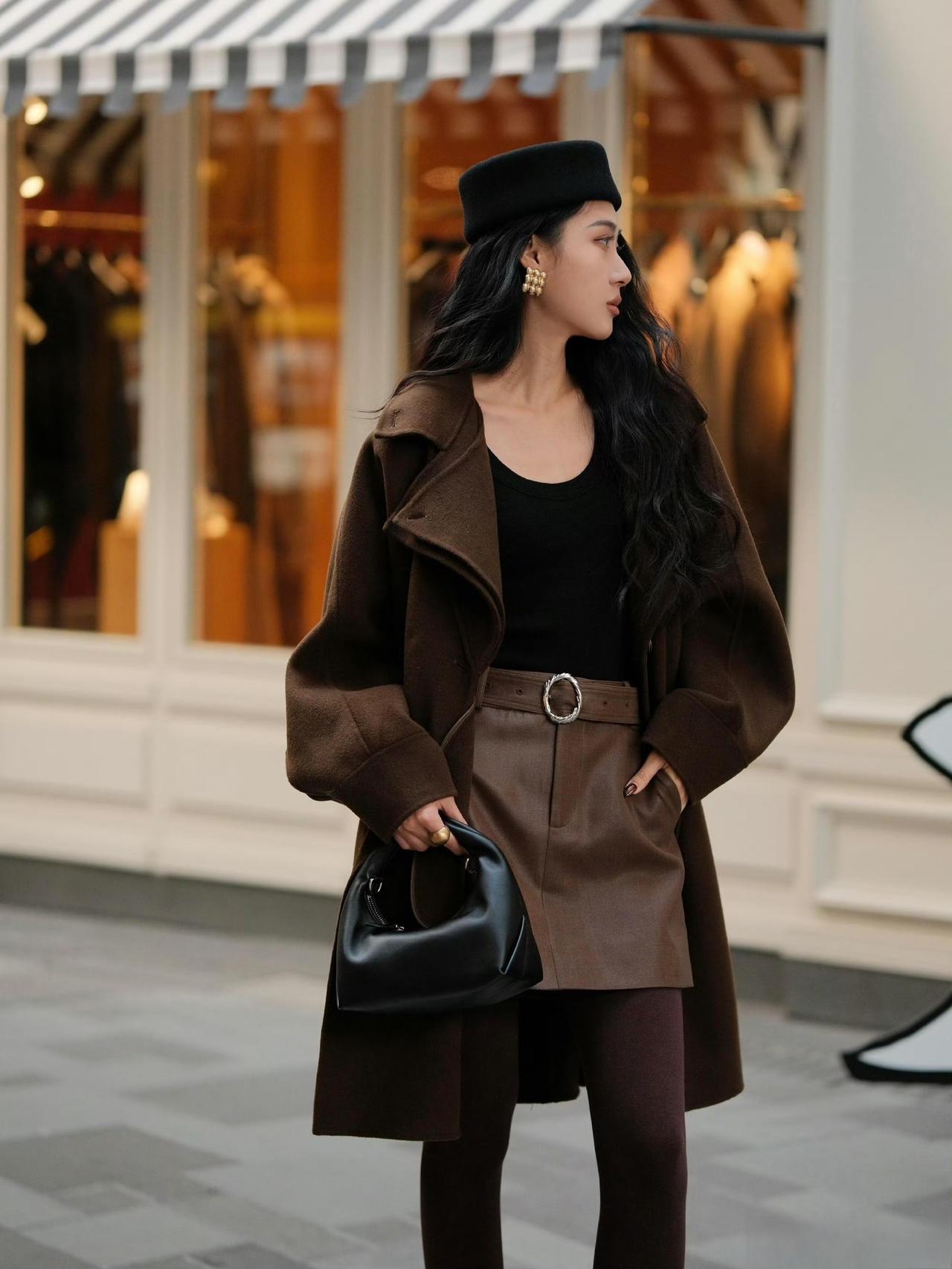 这套穿搭是复古高级的同色系秋冬风,质感与氛围都很出彩。全身以不同深浅的棕色为主调,大衣的毛绒质感+皮质短裙的利落,层次丰富又和谐;黑色内搭简约低调,突出了棕色系的复古质感;腰带的金属扣是点睛之笔,强化了腰线,让宽松大衣更显利落。 黑色贝雷帽+金属耳环增添复古精致感;黑色手提包与内搭呼应,平衡了同色系的单调,搭配棕色系带高跟,让造型更显完整。咖棕色系穿搭 咖色大衣搭配 棕色系穿搭