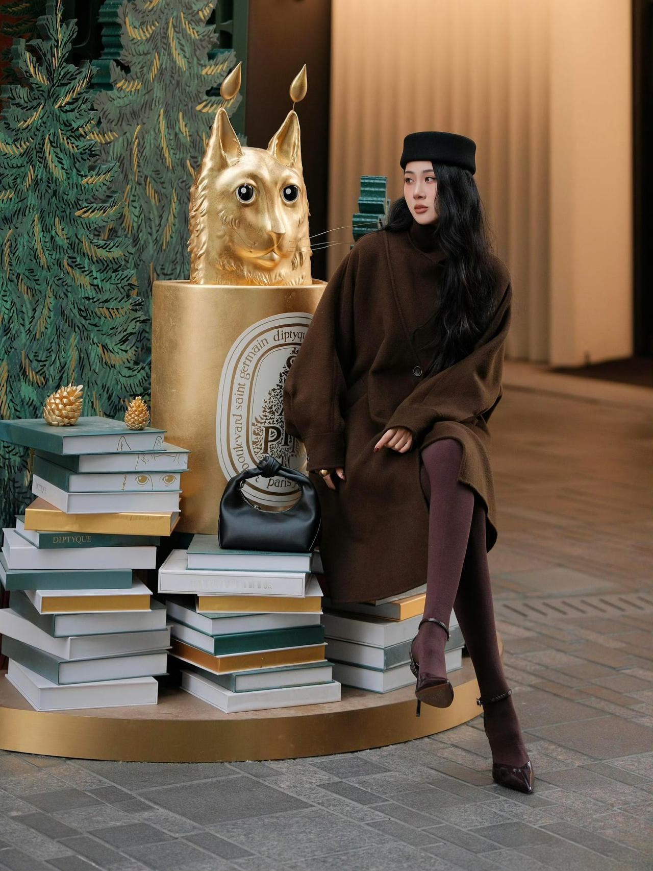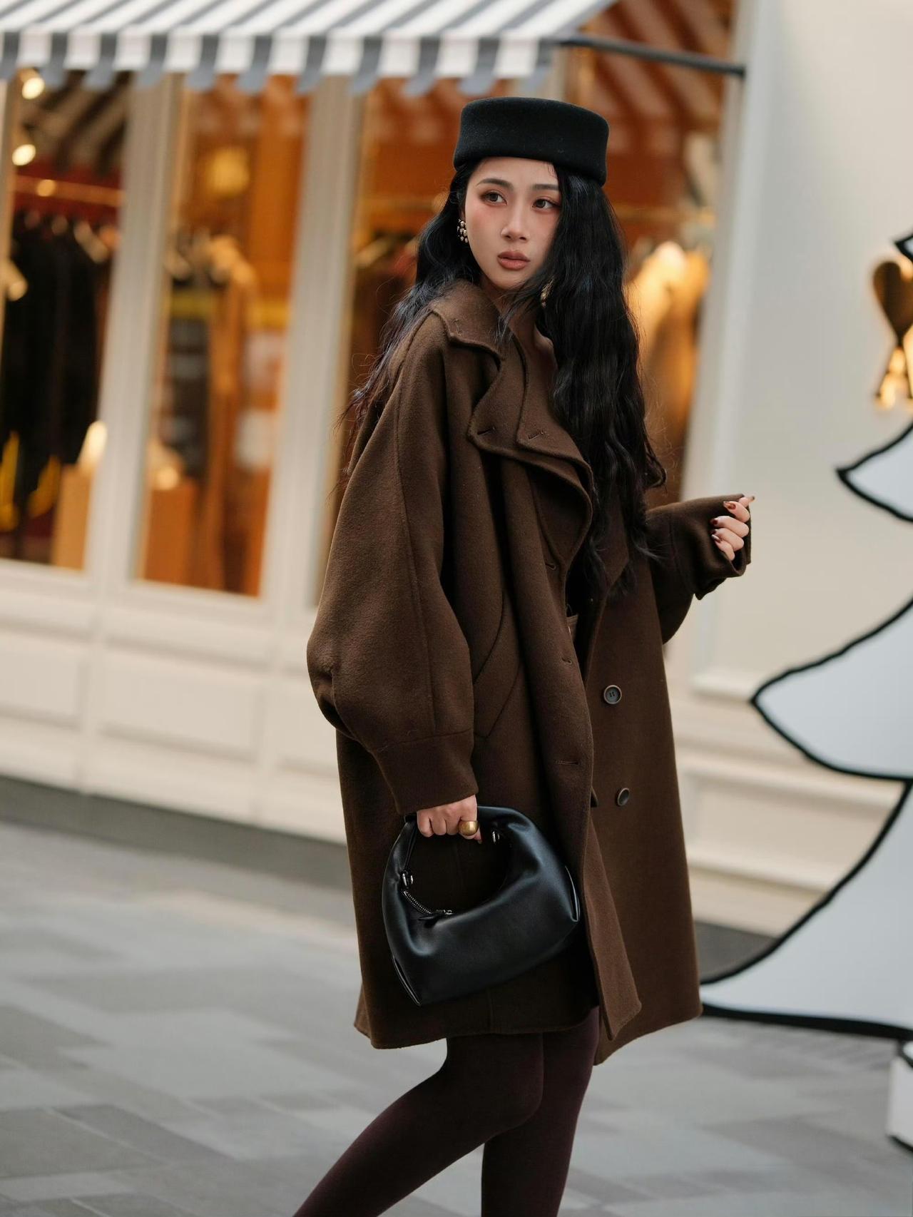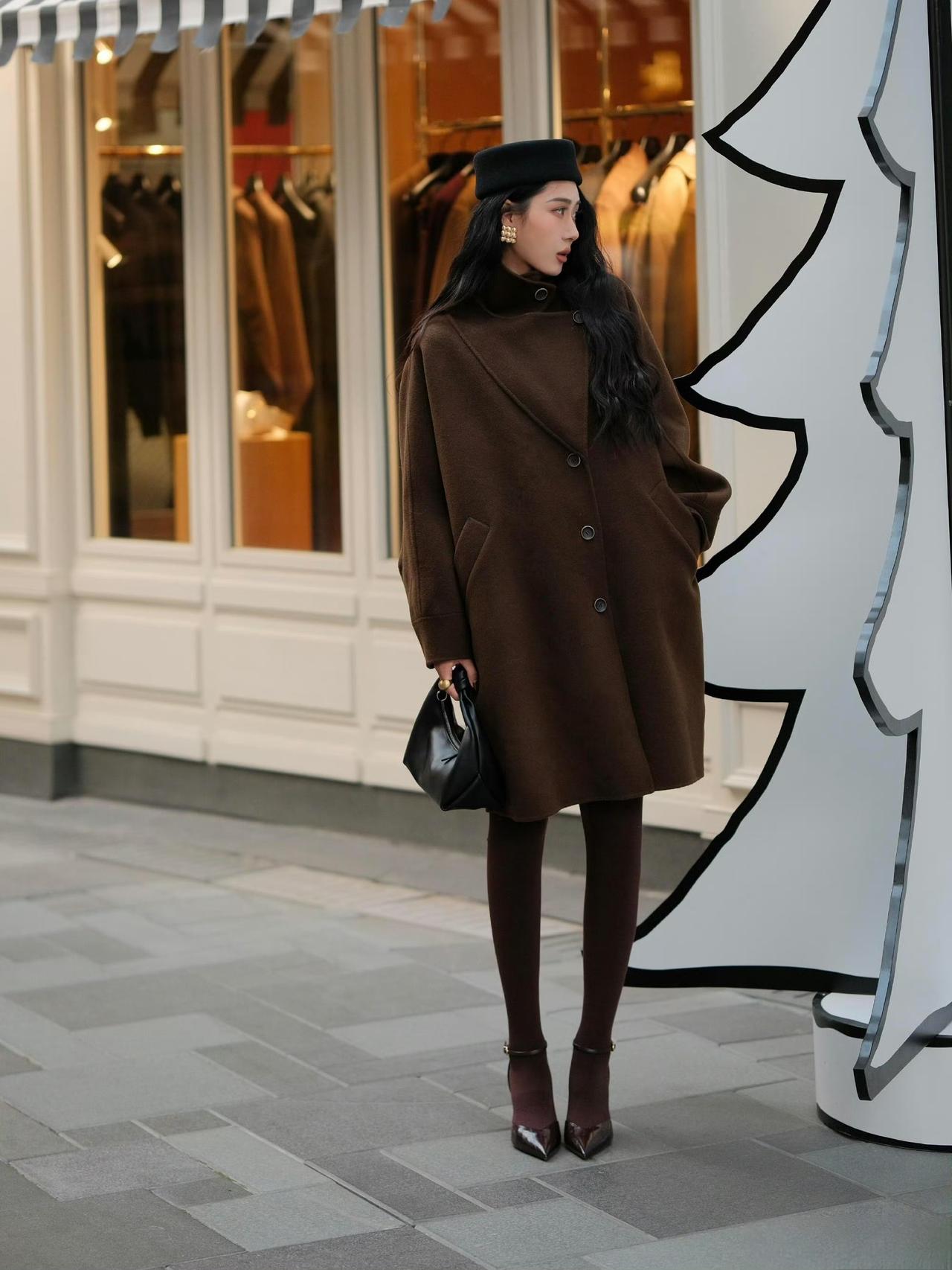 这套穿搭是复古高级的同色系秋冬风,质感与氛围都很出彩。全身以不同深浅的棕色为主调,大衣的毛绒质感+皮质短裙的利落,层次丰富又和谐;黑色内搭简约低调,突出了棕色系的复古质感;腰带的金属扣是点睛之笔,强化了腰线,让宽松大衣更显利落。 黑色贝雷帽+金属耳环增添复古精致感;黑色手提包与内搭呼应,平衡了同色系的单调,搭配棕色系带高跟,让造型更显完整。咖棕色系穿搭 咖色大衣搭配 棕色系穿搭