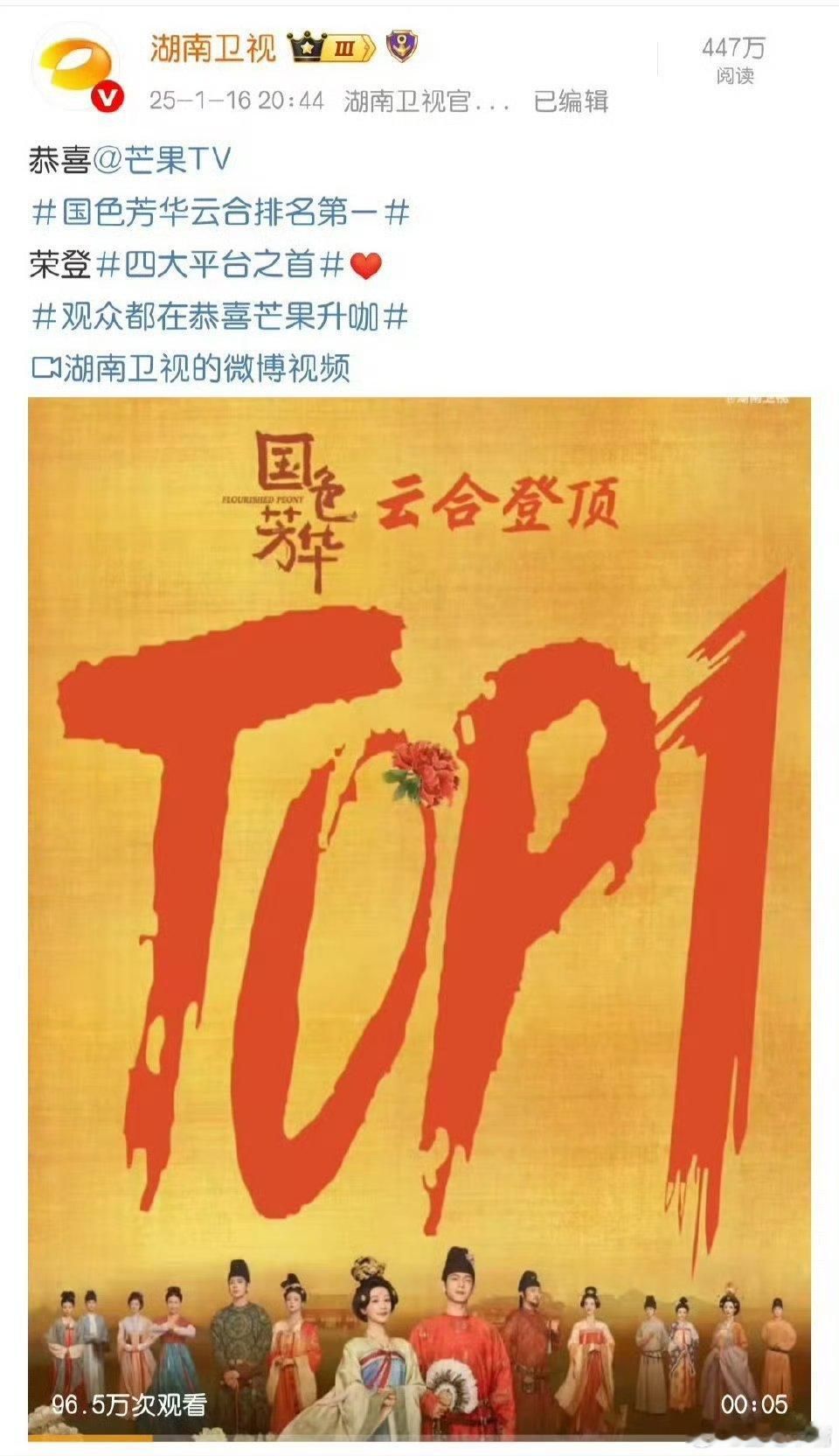 芒果TV认证国色芳华年冠尘埃落定! 芒果TV认定《国色芳华》播放量年冠! 2026年平台通案提议上,回顾2025年国名现象级大剧,提到国色芳华和锦绣芳华作为最出色的ip是国名现象级大剧,并认证国色芳华年冠成绩。国色芳华锦绣芳华不仅网播成绩优异,收视也是全年古装剧年冠,湖南卫视CVB年亚,集均播量冠军!