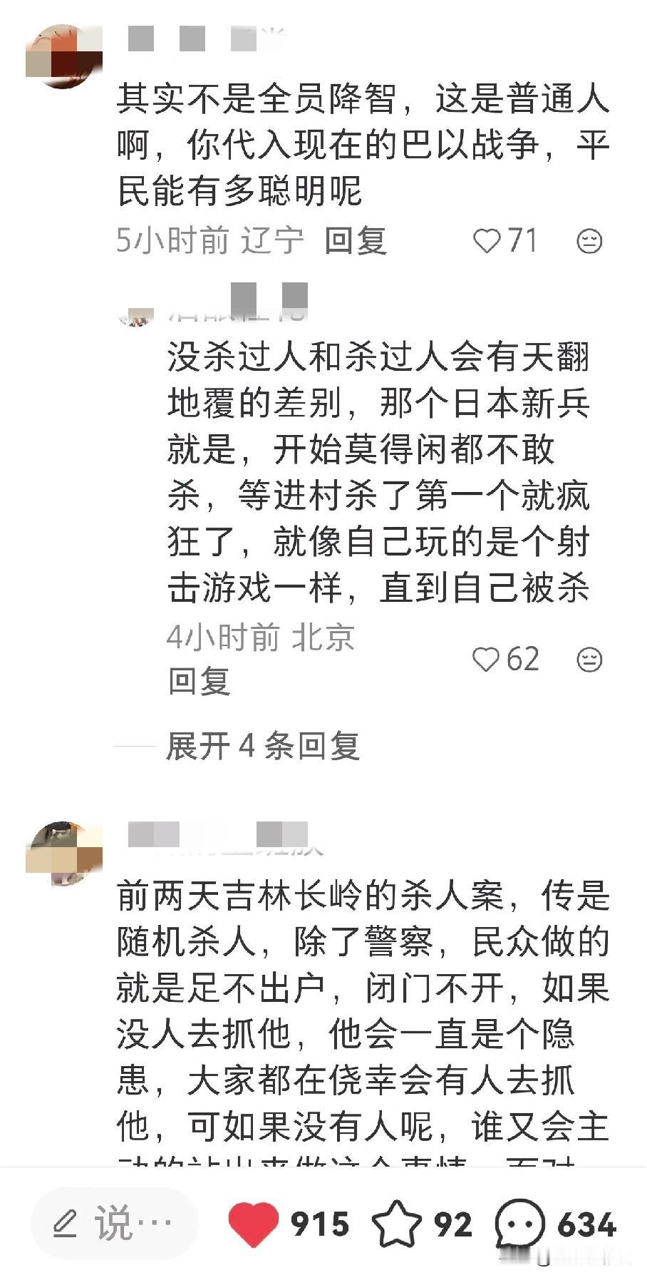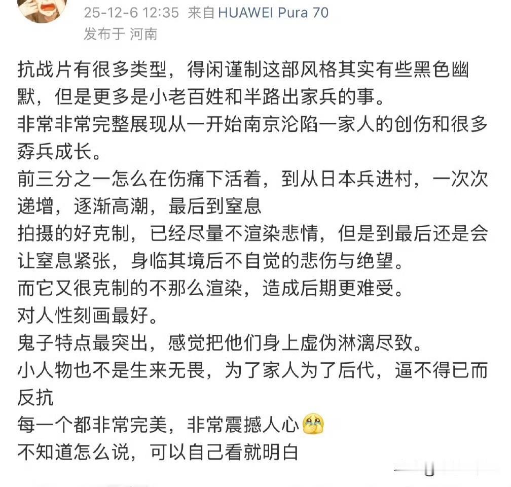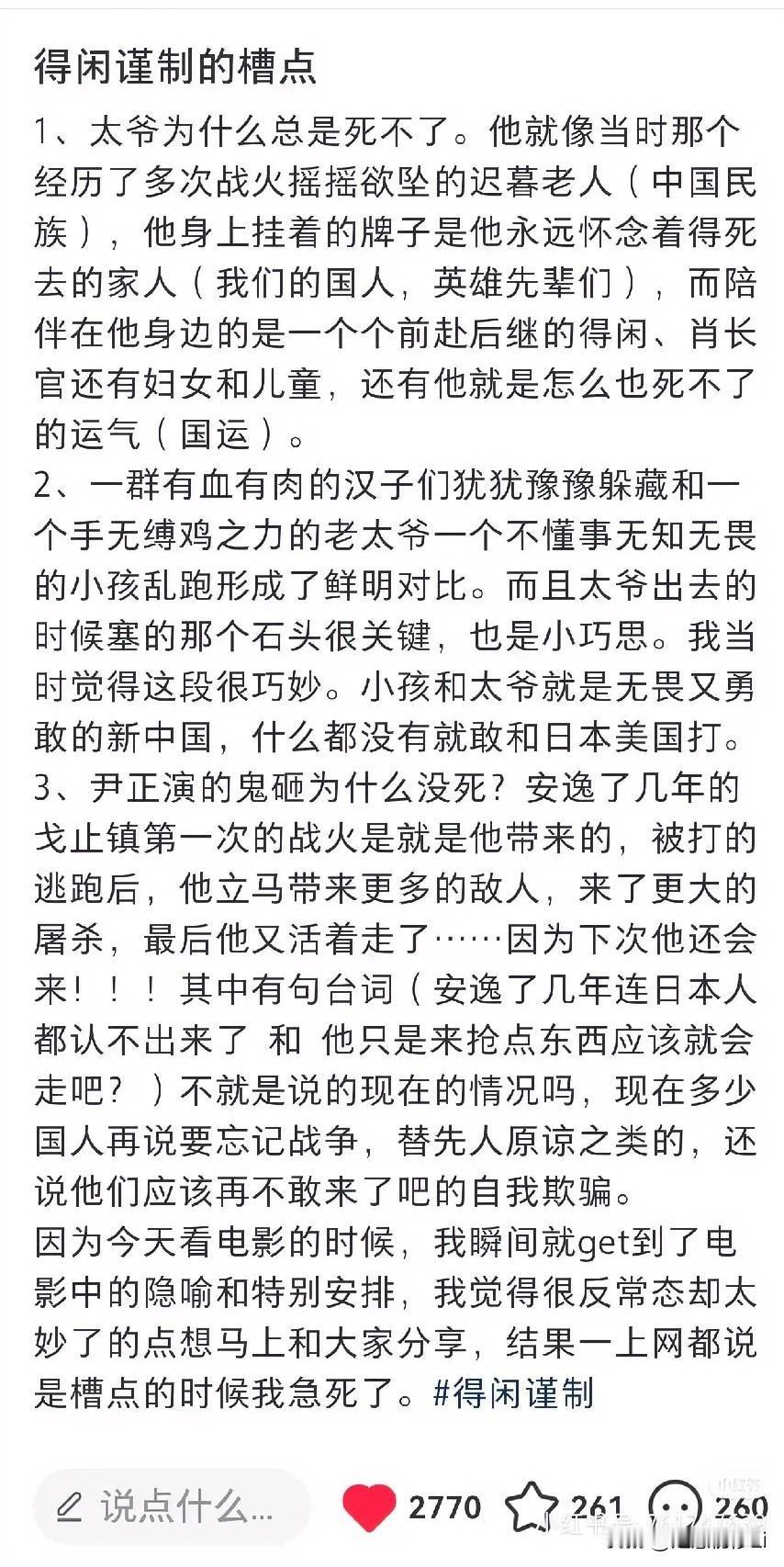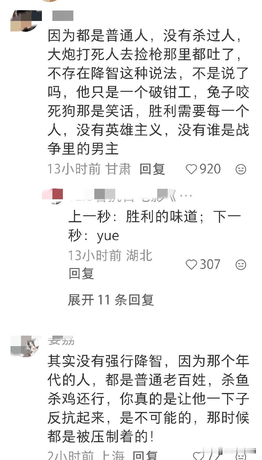 有观众说老太爷和孩子乱跑还死不了,是不是bug?村民是不是反应太慢,鬼子落单了都没人赶紧杀了? 这是看神剧看多了,以为老百姓杀人干脆利索,个个勇敢无畏,孩子遇到危险都安安静静。 真实的老百姓没有杀过人,不可能像军人一样,会害怕,会畏惧,会退缩,也会恐惧,杀了鬼子会呕吐,这才是正常人的行为。要不然南京大屠杀怎么可能死那么多人? 中国人一向是能忍则忍,以和为贵,不会像日本兵那样毫无人性。这就是中国人底色中的善良,可惜鬼子没有。所以莫得闲带村民反抗杀敌已经是极限了。观众扪心自问,自己遇到鬼子的枪炮能否挺身而出。不过好电影就是如此,观众有无限的讨论欲。肖战这部《得闲谨制》会成为经典电影[赞]