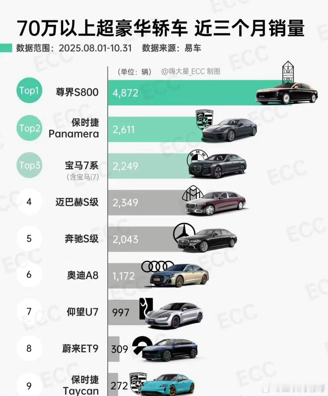 你知道尊界S800一个月能卖多少台吗?2000台!听着好像不算惊天动地?那你得看看它在跟谁比。就拿10月来说,豪华旗舰轿车市场里,排第二的保时捷Panamera卖了802台,第三的奔驰S级794台。这两大巨头加一块,都还没超过尊界S800的单月销量。这下明白这2000台的含金量了吧?它硬生生在曾经被BBA、保时捷牢牢把持的顶级轿车战场,撕开了一个口子。如果以后回看中国汽车的发展历程,尊界S800很可能被记上这么一笔:“它真正打破了豪华旗舰轿车市场长期以来的外资垄断,让国产车也有了站稳金字塔尖的底气。”