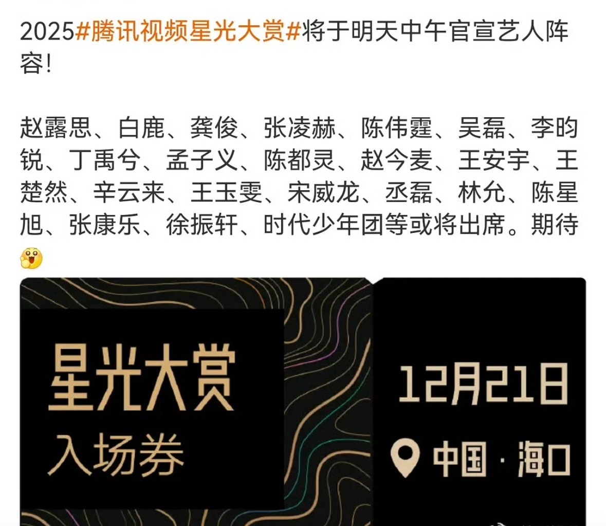 星光大赏明天中午正式官宣名单,有没有想看的?90生:檀健次 龚俊 刘宇宁 丞磊 90花:鞠婧祎 白鹿 陈都灵95生:张凌赫 吴磊 李昀锐 丁禹兮 王安宇 宋威龙 陈星旭95花:赵露思 田曦薇 孟子义 李兰迪 周也 王楚然 王玉雯 00花生:张康乐 徐振轩 赵今麦 时代少年团