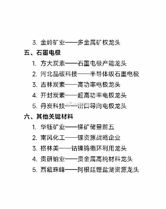 稀缺材料概念细分龙头汇总 一、稀土领域 1.北方稀土——轻稀土龙头 2.中国稀土——重稀土龙头 3.厦门钨业——稀土技术领先企业 4.盛和资源——稀土金属出口主力 5.有研新材——超高纯稀土金属龙头 二、钨钼领域 1.厦门钨业——钨材料全球领先 2.中钨高新——硬质合金龙头 3.章源钨业——钨产业链完整龙头 4.金钼股份——亚洲最大钼业公司 5.洛阳钼业——国际化钼钴铜龙头 三、稀有金属 1.锡业股份——全球锡业第一 2.云南锗业——锗产业链完整龙头 3.驰宏锌锗——国内锗产量第一 4.东方钽业——全球钽丝市占率第一 5.东方锆业——锆产品全球领先 四、钛钒领域 1.宝钛股份——中国钛材龙头 2.钒钛股份——钒钛磁铁矿综合利用龙头 3.金岭矿业——多金属矿权龙头 五、石墨电极 1.方大炭素——石墨电极产能龙头 2.河北晶碳科技——半导体级石墨电极 3.吉林炭素——高功率电极龙头 4.开封炭素——超高功率电极龙头 5.丹炭科技——出口导向电极龙头 六、其他关键材料 1.华钰矿业——锑矿储量前五 2.南风化工——镓资源战略企业 3.格林美——钴镍钨循环利用龙头 4.贵研铂业——贵金属高纯材料龙头 5.西藏珠峰——阿根廷锂盐湖资源龙头