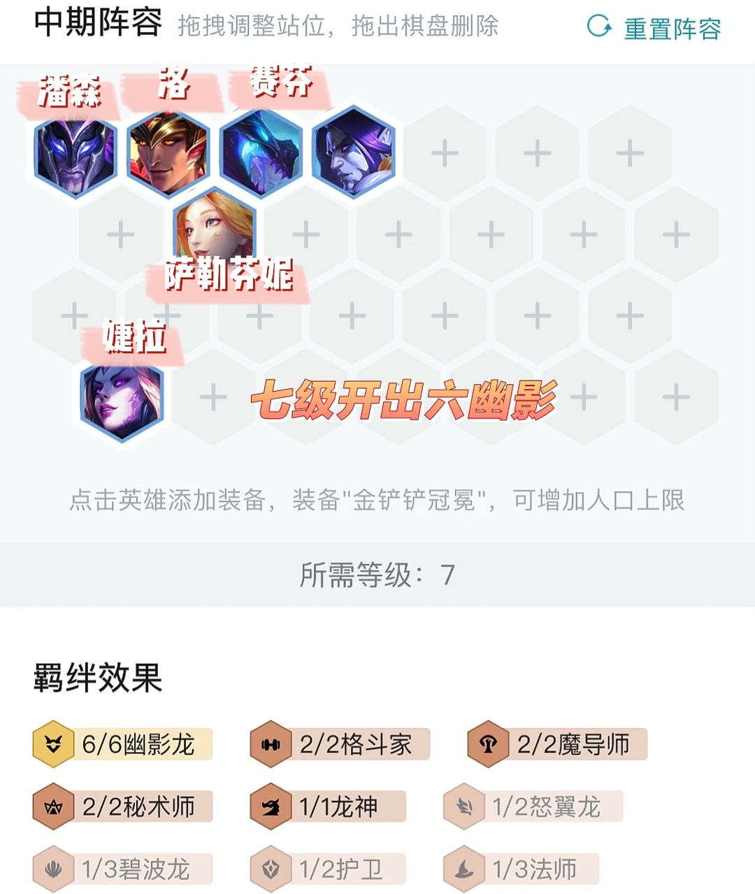 过度到7级如果血量经济健康则可以直接上8抽牌。如果血量在70以下则7人口抽出六幽影和二星婕拉即可。