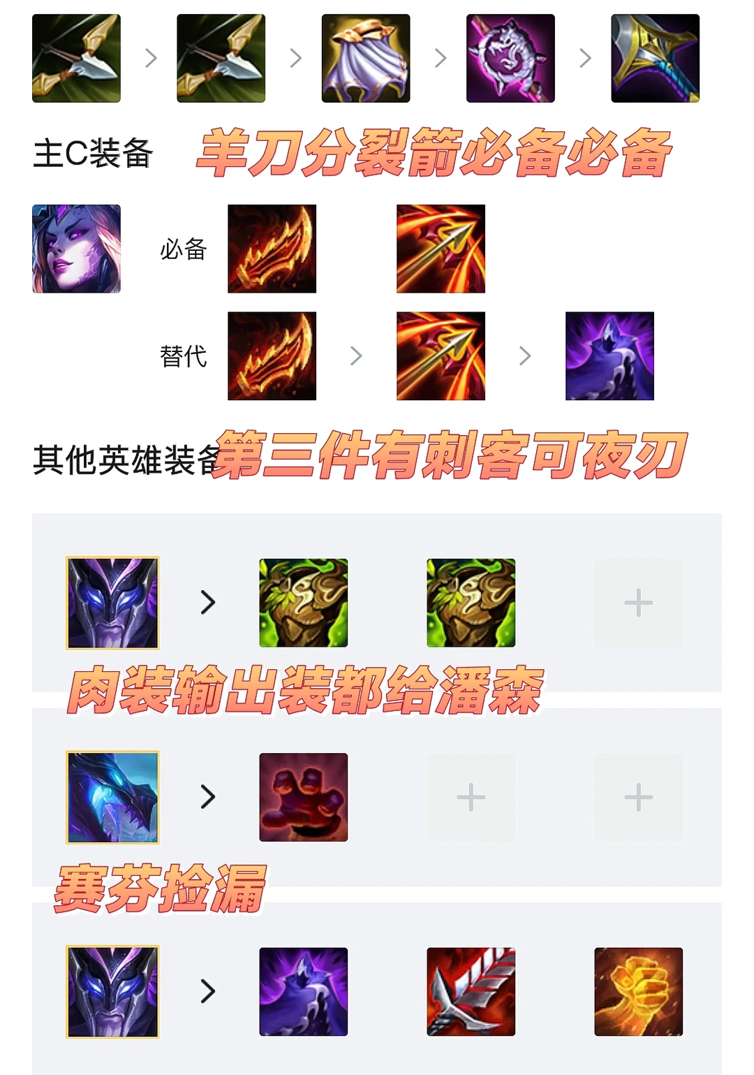 装备是这套阵容的重心,婕拉羊刀分裂机缺一不可。不管是卖血还是靠野怪都好,保证装备正确。