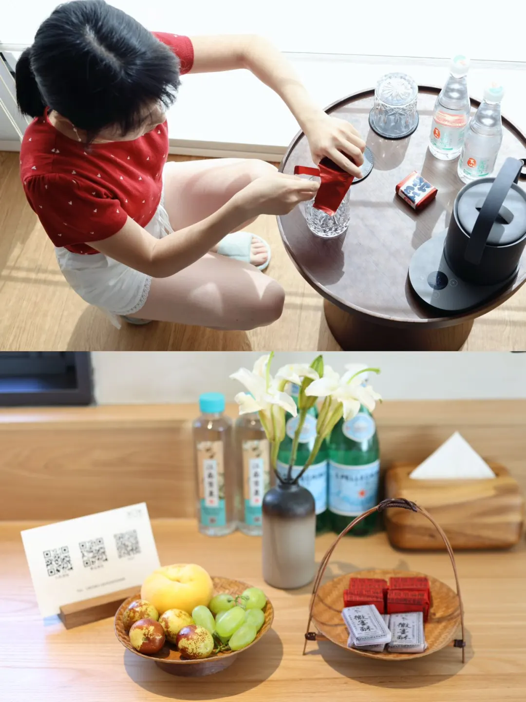 我住的是二楼的11号房,宽敞的空间,能看到老建筑的窗子,大大的浴缸🛁,干净舒服的大床,提前放好的新鲜水果、祁门红茶和徽州糕点……细节之处皆是诚意👍开了3个小时的老公换了衣服,马上躺了上去,把自己包裹在云朵一样舒服的被子里,而我像回到了自己家一样,马上烧水泡茶,端坐在窗边,用上了下午茶🫖。