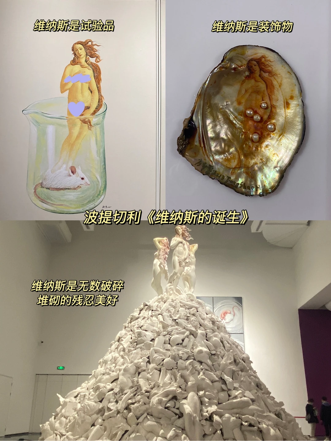波提切利的维纳斯也被改造了,有时她们会被装进盛有小白鼠的实验瓶;有时会被放进镶嵌珍珠的贝壳;有时会被安在破碎的石膏堆砌的山顶。