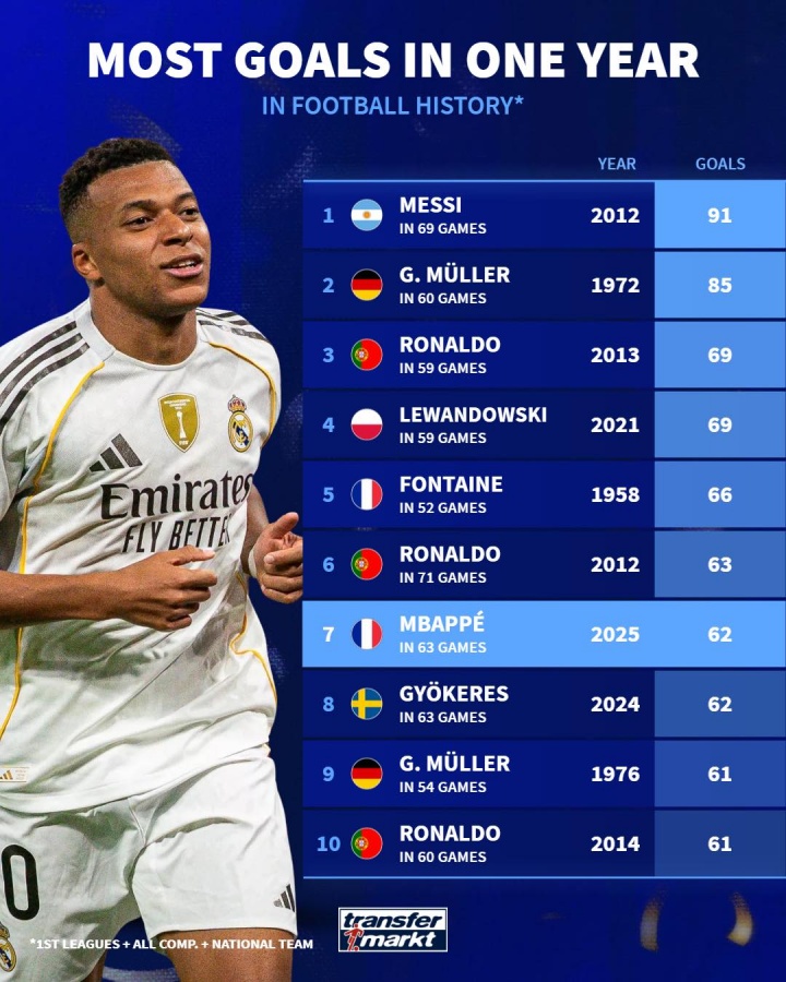 直播吧12月08日讯姆巴佩今年进球已达62球,进入历史前十,德转盘点了足坛历史自然年进球纪录。