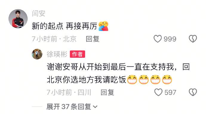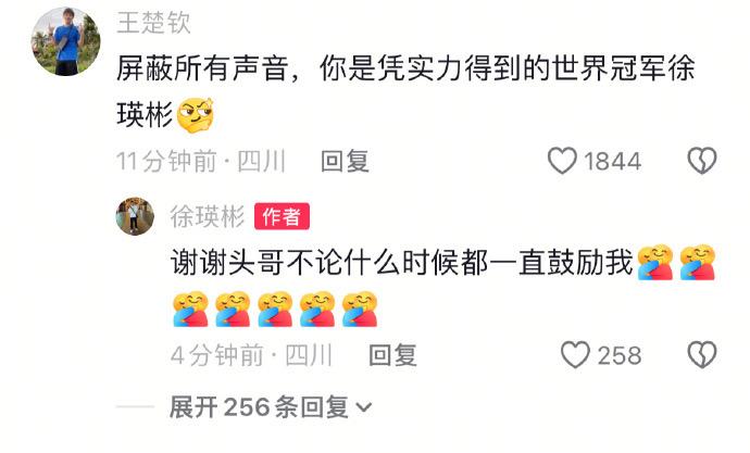 随后,王楚钦、梁靖崑、曹巍、闫安等运动员赶来为徐瑛彬加油打气。王楚钦:屏蔽所有声音,你是凭实力得到的世界冠军徐瑛彬。