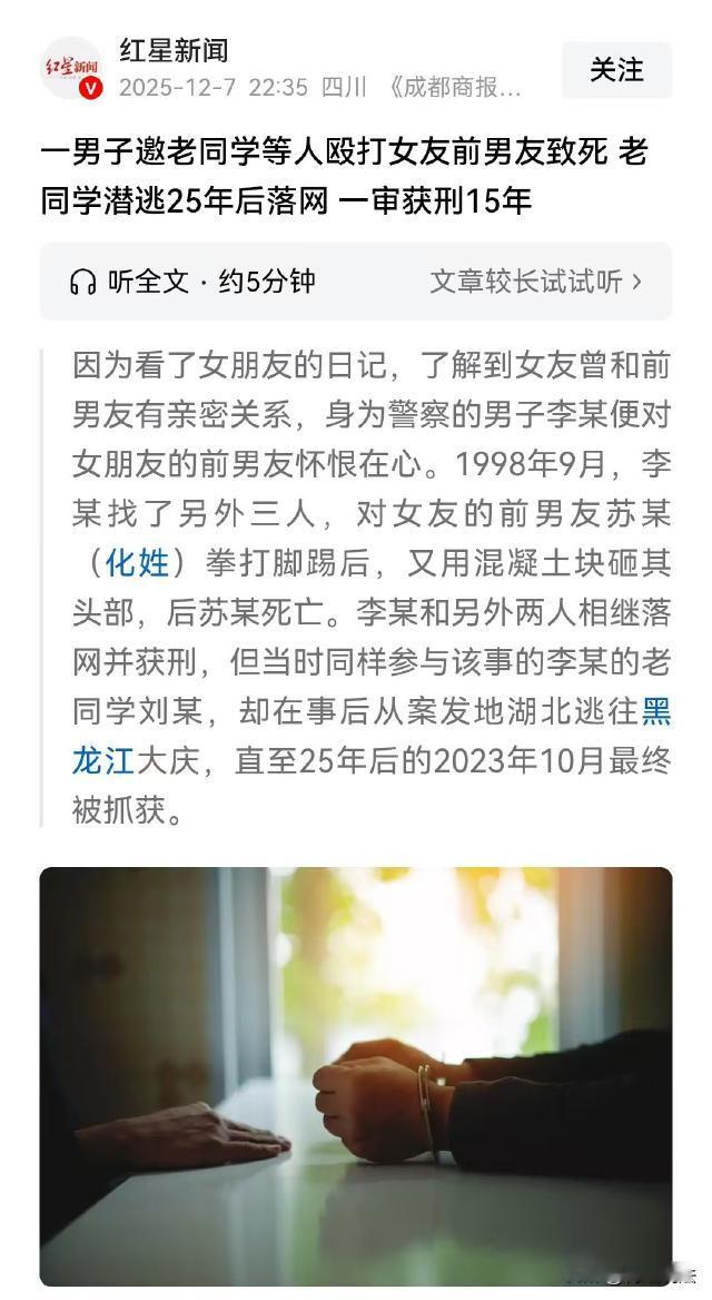 湖北宜昌,男子偷看女朋友日记,发现她曾和前男友发生过关系,男子怀恨在心邀请三个同学一起殴打前男友致其死 亡。案发后男子和两名同伙分别获刑,但最后一人却人间蒸发了。近日,最后一名犯罪嫌疑人终于被捕并受到处罚。 据红星新闻等报道,李某是一名民警,1998年间,他偷看女朋友日记,发现女友曾经和男子苏某有过恋爱关系。 李某心里对苏某产生不满,然而,接下来女朋友日记中的内容让他直接破防了。原来,女朋友和苏某恋爱期间,竟然和苏某发生过关系。 李某嫉妒愤怒之下,对苏某产生了严重的仇视心理。同年9月,愤恨难消的李某邀请了同学刘某及另外两个朋友,决定对苏某进行报复。 经过一段时间的跟踪踩点,李某四人搞清楚了苏某的行动轨迹。 9月17日,李某借来一辆警车,和刘某四人蹲守在苏某必经之路上。几人提前说好,要给苏某个教训,等苏某到来后,狠狠打他一顿再砍他两刀就跑。 不久,苏某骑着摩托车过来了,四人拦下他的摩托车,对他进行了殴打。 期间,他们将苏某按住后,用马路旁边的混凝土块猛砸苏某的头,等苏某不动弹后,又将他扔到了公路坎下面,随后四人开车逃离现场。 不久,苏某被人发现,可此时他早就失去了生命体征。 经鉴定,苏某系他杀,其生前头部遭受钝器多次暴力击打,颅骨凹陷粉碎性 骨 折,因脑膜外淤 血及破裂,脑组织挫 伤,导致其大量失 血及脑 机能紊乱死 亡。 不久,李某及两名同伙被抓捕归案,其中,李某因故意伤害罪被判处无期徒刑,剥夺政治权利终身。 但是,李某的同学刘某却消失了,多年来一直杳无音讯。 然而,随着科技的发展,2023年民警在黑龙江大庆市发现了刘某的踪迹,同年10月19日刘某被抓获。 检方认为,刘某构成故意伤害罪,联系以故意伤害罪判处刘某有期徒刑15年。 但是,苏某家属认为,当年李某伙同其余三人对苏某进行暴力殴打,在苏某失去反抗能力后,仍用脸盆大小的混凝土块砸他的头,根据现场喷射状血迹可以看出,李某四人手段及其残 忍。因此,四人不是故意伤害,而是有预谋的故意杀 人。 那么,李某、刘某四人到底是构成故意伤害罪还是故意杀 人罪? 根据《刑法》第二百三十二条规定,故意杀 人的,处死刑、无期徒刑或者十年以上有期徒刑;情节较轻的,处三年以上十年以下有期徒刑。 判断刘某等人是否构成故意杀 人罪,需从主观故意和客观行为两方面综合考虑。 从主观来看,据刘某等人供述,他们是为了教训、报复苏某。 李某偷看女友日记后得知了苏某与女友的关系,经过一系列预谋后,李某等人打听到了苏某的工作单位、借用警用车牌和车辆,可见其报复意图强烈。 案发当天,苏某已经被控制且丧失反抗能力后,李某等人仍持混凝土持续多次猛砸苏某头部,逃跑前还将被害人抛于公路坎下,使他失去被救助的机会。 综合李某刘某等人的所有行为,可以看出他们完全不顾苏某生死,这也充分表明,他们具有剥夺他人生命的主观故意。 此外,在殴打苏某过程中,他们使用混凝土块这种具有较大杀伤力的工具,针对头部这一人体重要部位进行猛击,打击强度大,且在被害人失去反抗能力后仍不停止,还将其抛于公路坎下,让被害人失去被救的可能。 因此,刘某等人的行为构成的应该是故意杀 人罪,而非故意伤害罪。 另外,依据《刑法》第二十六条规定,组织、领导犯罪集团进行犯罪活动的或者在共同犯罪中起主要作用的,是主犯。 本案中的四个犯罪嫌疑人属于共同犯罪,李某作为报复行动的发起者和组织者,应当认定为主犯。 刘某在实施犯罪的过程中,积极配合李某对苏某实施辨认、跟踪,案发当天还直接动手殴打苏某,并持混凝土块猛砸苏某头部,在整个犯罪过程中起到了主要作用,因此应当被认定为主犯。 经审理认为,虽然刘某的作用与李某相比相对较小,但他全程参与,且积极实施加害苏某的行为,应当认定为主犯。。 刘某到案后自愿认罪,但当庭对主要犯罪行为不如实供述,且前后供述不一致,也未作出合理解释,不能认定其具有坦白情节。 刘某被捕后,其家属赔偿了苏某家属25万元并取得谅解,可酌情从轻处罚。 但刘某的犯罪手段极其残忍,造成的后果特别严重,其可酌情从轻处罚的情节,并不足以对他从轻处罚。最终,刘某被判犯故意杀 人罪,被判处有期徒刑15年。
