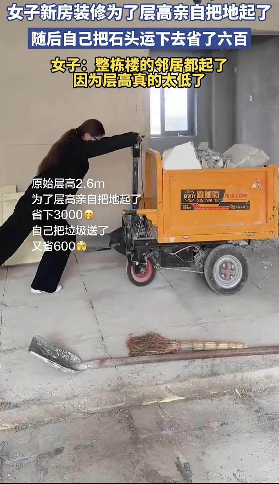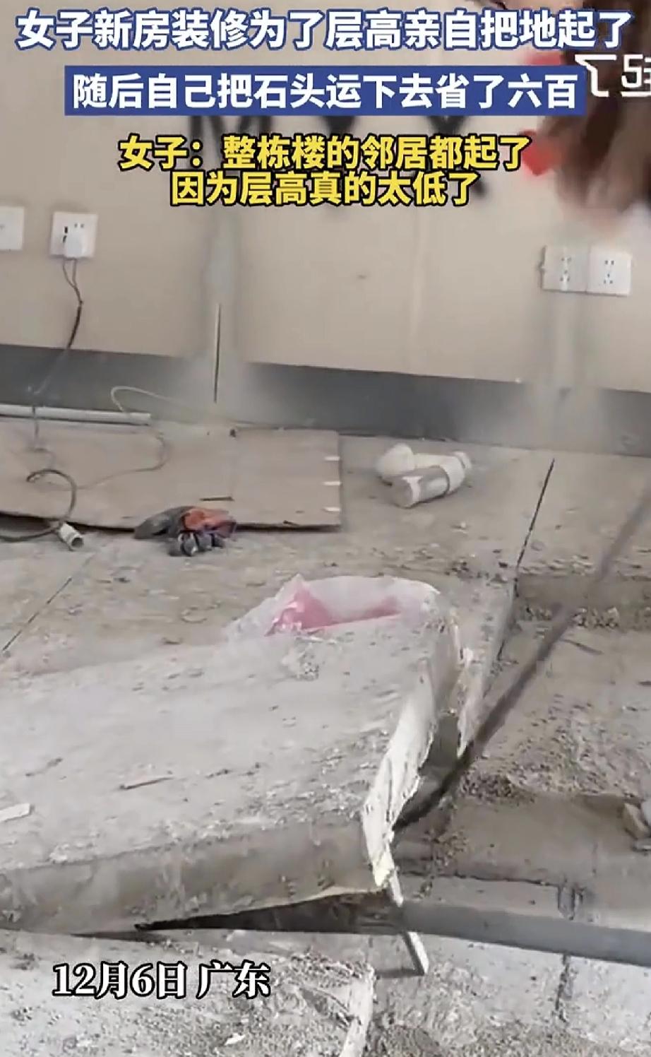 广东,一女子在网上分享,她最近拿到自己买的新房后,其他方面都满意,但就是屋内层高太低,后去看了这栋楼邻居装房,邻居们为了让楼层高一些,便都将地板的最表面一层给取了。还别说,邻居们去掉一层地板后,这屋内层高明显看起来不一样了,于是女子也亲自动手取掉了新房的一层地板。事后女子也高兴的表示,取了一层地板后不但层高高了,房子也看起来宽敞了,而且自己动手还省了三千多的人工费。但网友们却在评论区发表了对于此事的利弊看法。 有网友就表示:女子很勤奋,自己动手丰衣足食,虽然自己累点,但层高高了钱也省了,一举两得。但拆了底板是不是更薄了,会不会有安全隐患? 也有网友表示:开发商绝对不会平白无故给你这么做,确实这层的效果就是找平、隔音、保温,你们都这样弄,走楼上稍微走动就有噪音,老遭罪了! 还有网友表示:确实如此 我家楼上邻居就是这样弄的,现在她们大声说话我都能听到,还一天到晚叮叮哐哐的,我们住楼下的很无奈。所以应该禁止这种装房行为。 不得不说,女子将这厚厚的一层地板拆了后,屋子层高确实不一样了,但正如网友担心的,这么拆对保温、隔音、安全有影响吗?对此大家怎么看?