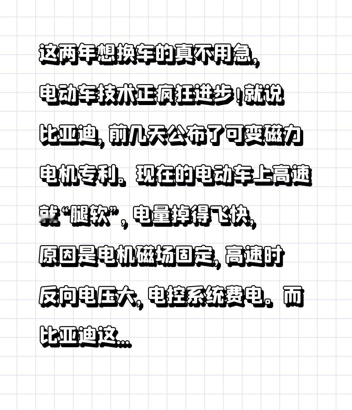 这两年想换车的真不用急,电动车技术正疯狂进步! 就说比亚迪,前几天公布了可变磁力电机专利。现在的电动车上高速就“腿软”,电量掉得飞快,原因是电机磁场固定,高速时反向电压大,电控系统费电。而比亚迪这个新电机能让磁场可变,起步、爬坡时调强磁场,扭矩大;高速巡航时调弱磁场,更省电,就像给电机装了“智能换挡器”。 此外,固态电池量产线已搭建,静电电机也在研发。买车别急,说不定明年就有新技术,现在买很可能被背刺,不如再等等。 比亚迪磁流悬架