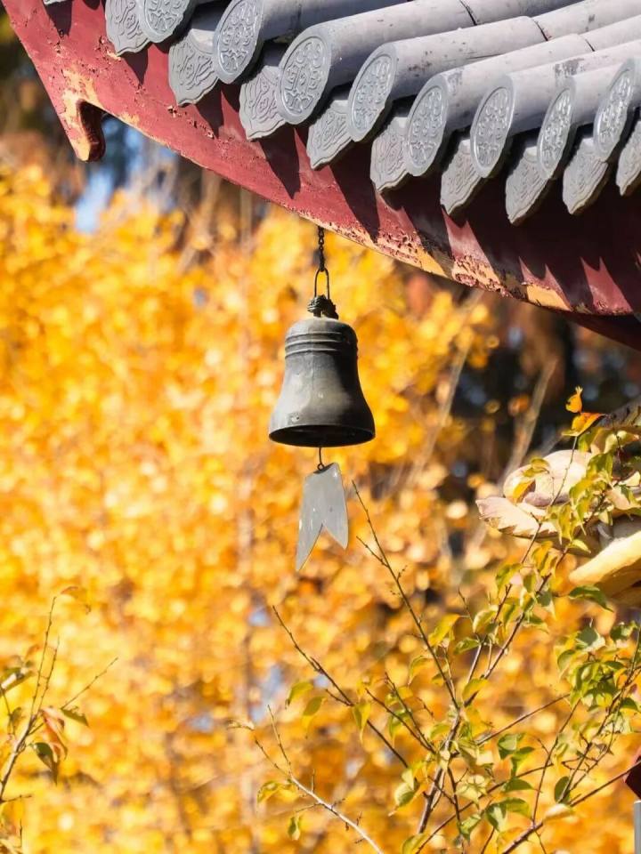 透过银杏枝丫,能望见寺庙的翘角飞檐;