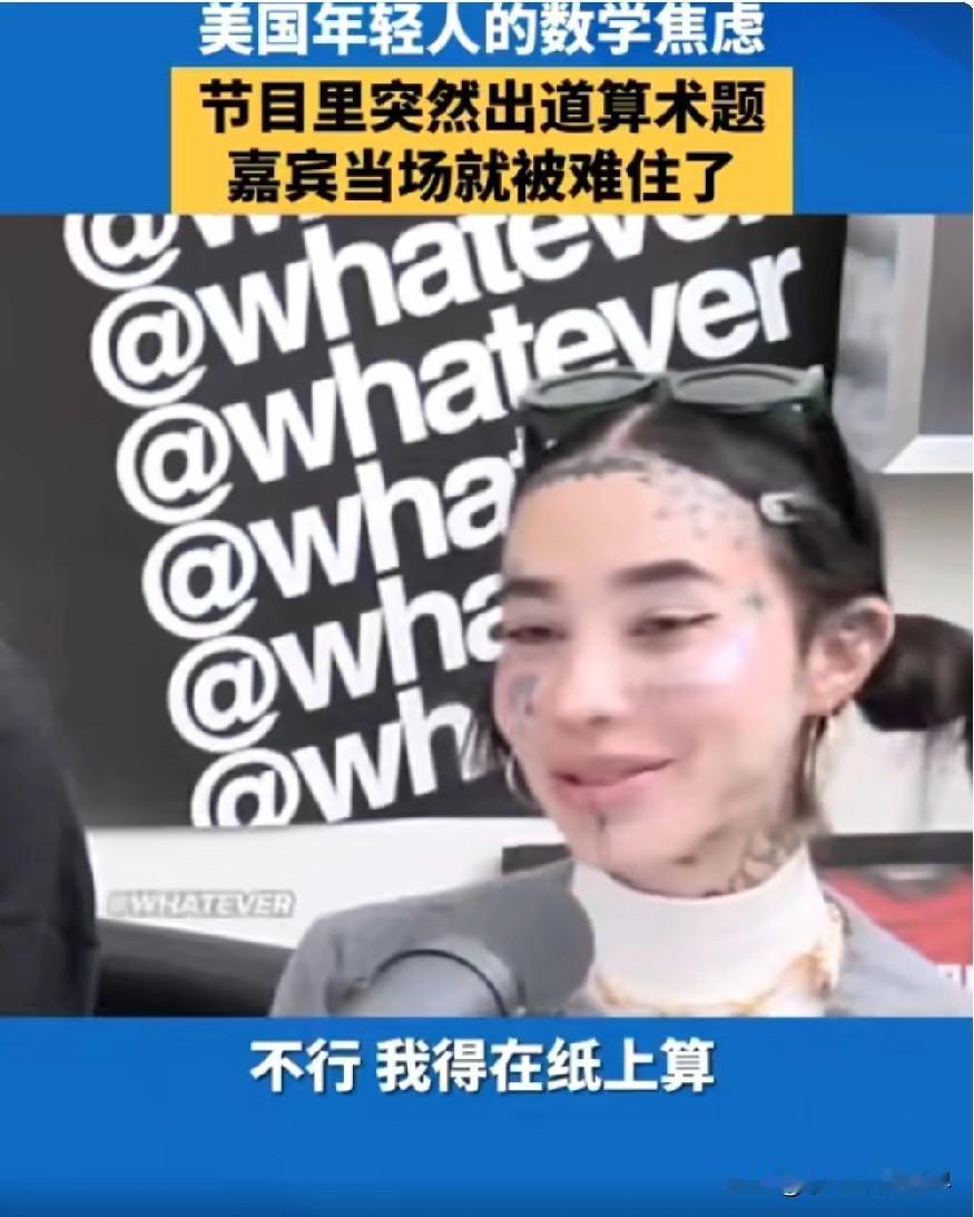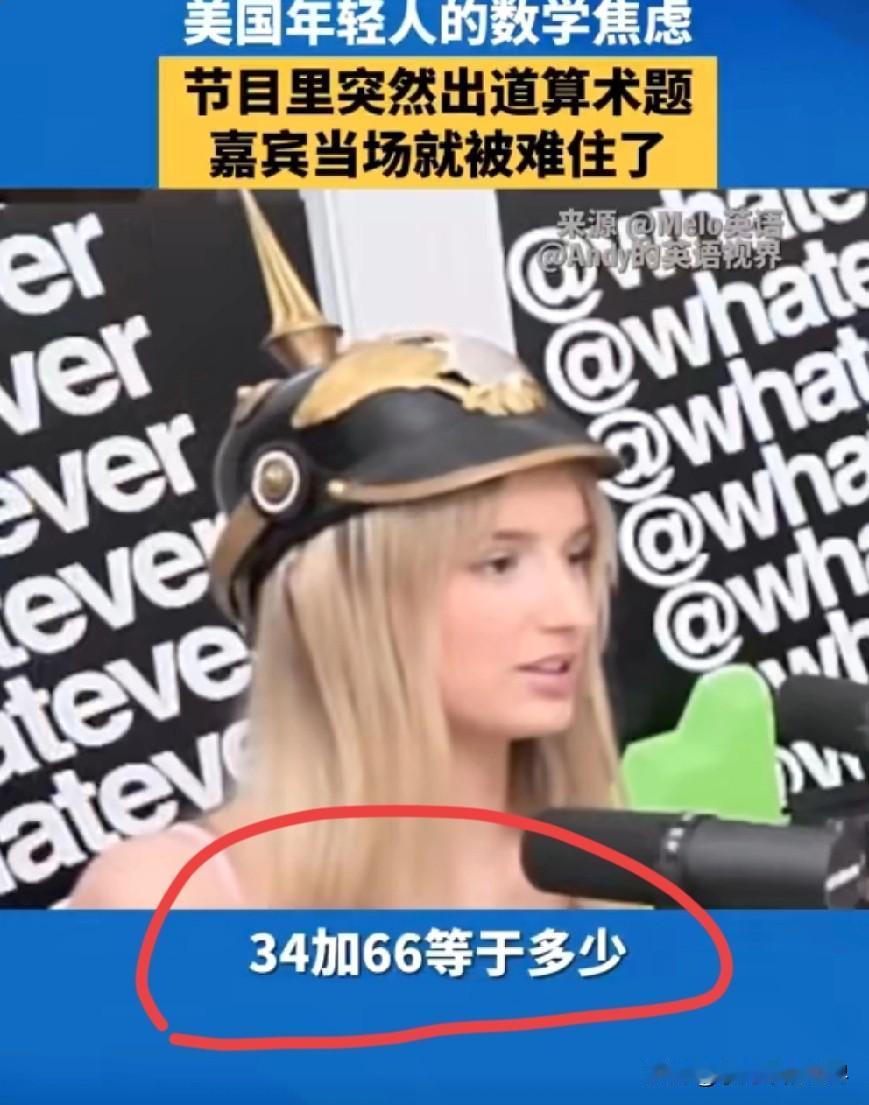 34+66=?想了半天,给出了一个95。 美国一档节目中,主持人给参加节目的美国年轻人出了一道算术题,34+66=? 节目里的年轻人都答不出这道题,还必须给他一支笔,在纸上面算,结果还是没算出来。 我不是夸自家孩子,这种两位数加减法,我家5岁女儿都会算。 有网友说了,不就一道数学题没算出来,有什么? 人家是没算出题,但人家眼里有光,清澈的愚蠢的光[捂脸] 你要说是乘法吧,两位数的用个笔思考一下还能理解。 一道加法题,还得用笔纸上面算,关键是最后还算错了。 看这几个孩子有个十六七,起码高中生了,结果连个两位数算术题都算不出来,他们上学不学算术吗?