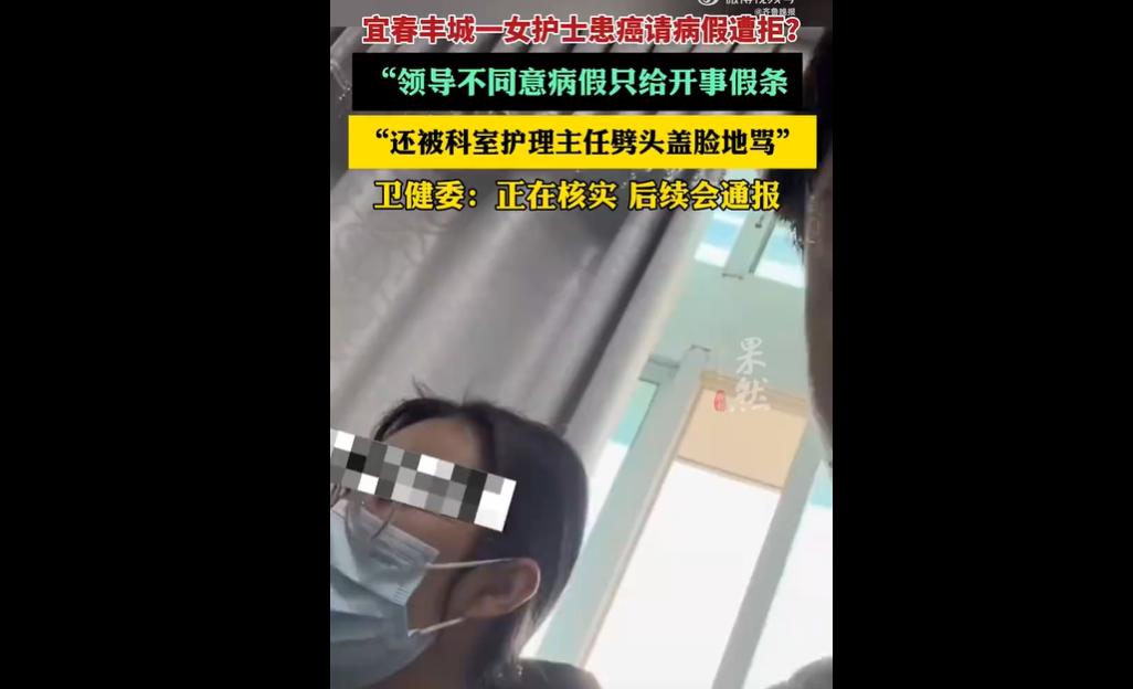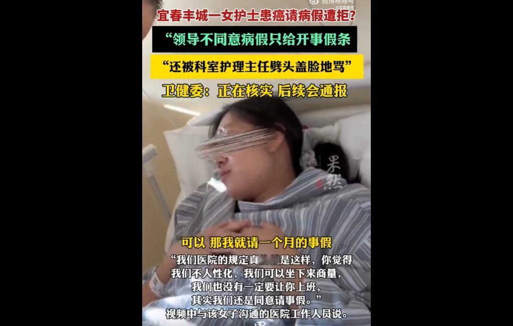 宜春丰城中医院一名工作 5 年的女护士确诊肺癌,持盖有医院公章的疾病证明和病假条,申请复查后的 14 天病假遭拒。 院方依据内部规定,以 “门诊病假条无效” 为由,要求提交 “住院治疗证明” 才批病假,仅同意按事假处理,护士还接到科室护理主任的责骂电话。 该事件引发网友热议,质疑院方规定缺乏医学合理性,无视癌症康复期门诊复查的实际需求。 丰城市卫健委已介入核实,通报显示护士首次 1 个月病假已获批,争议聚焦后续 14 天门诊病假,院方被批机械执行制度、缺乏人文关怀。 这事儿看着就让人寒心! 护士在医院干了 5 年,熬出肺癌不说,拿着正规病假条请假还被百般刁难,非要死卡 “住院证明”,难道癌症康复期门诊复查不算生病? 护理主任还骂人,这哪有一点对患者、对员工的基本尊重? 作为医疗单位,本该最懂病情和康复常识,却偏偏机械执行冰冷制度,把 “人性化” 挂嘴边却不落实。 制度是为了规范管理,不是用来折腾人的,连癌症患者的合理请假需求都满足不了,还谈什么医者仁心? 更让人无奈的是,这种机械办事的情况不是个例。 职场健康权不能只停留在口号上,制度得有弹性,多站在员工角度考虑实际情况。