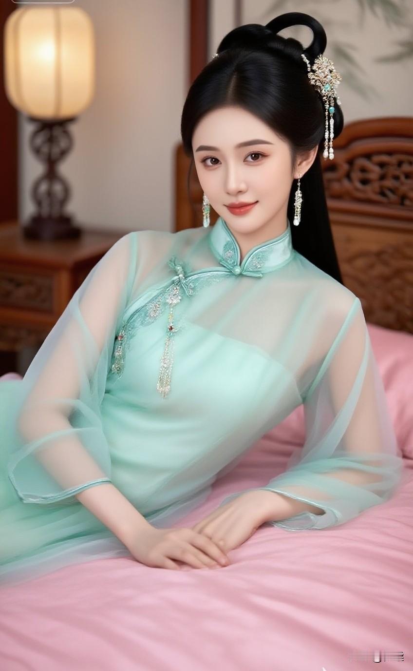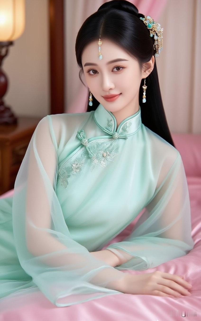温柔古典美人,浅蓝旗袍,优雅气质,梦回古代