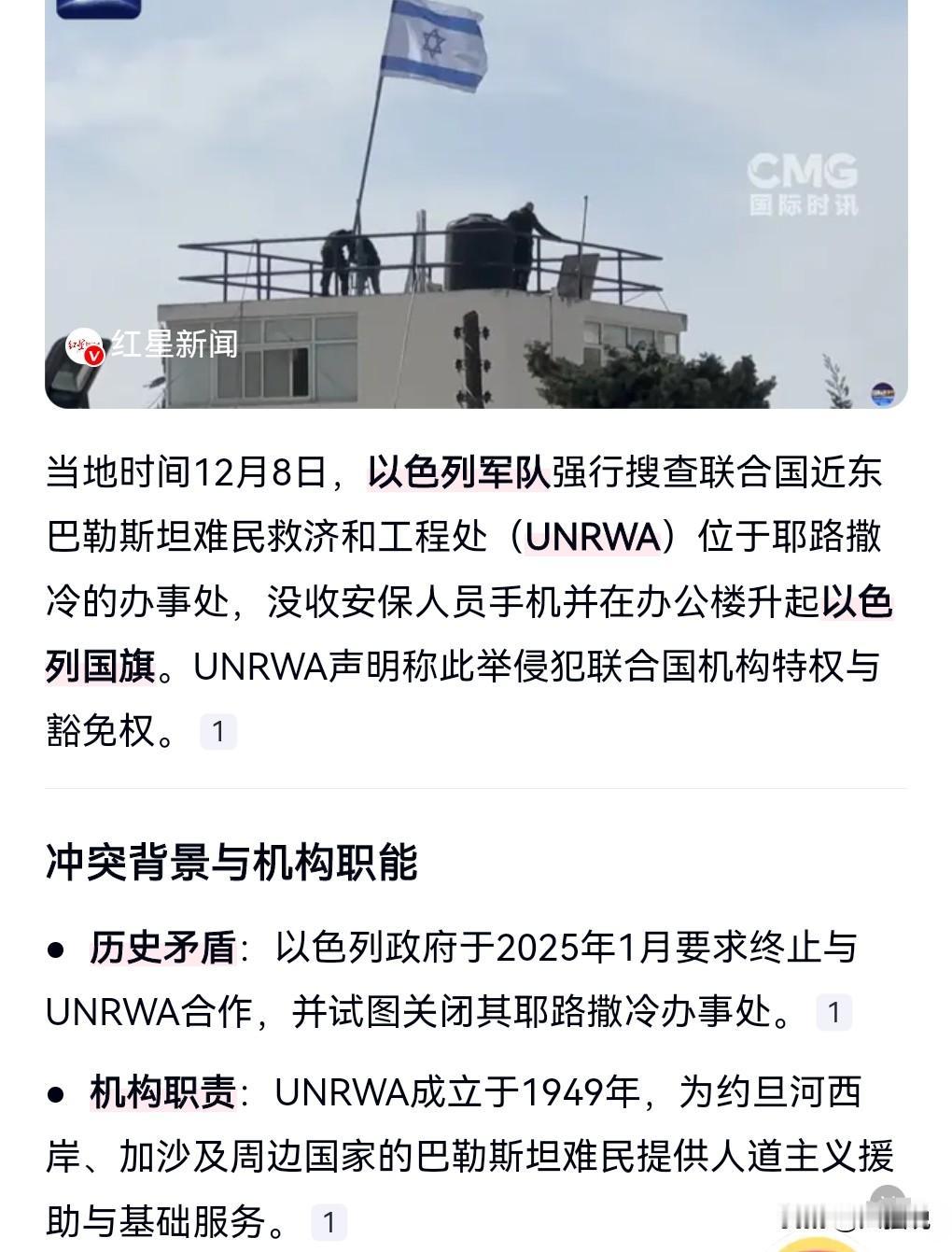以色列真的是太无法无天了。 竟然连联合国都敢得罪,完全不把联合国放在眼里。 当地时间12月8日,以军强行进入联合国机构办公地,这是一种严重的侵犯。 更猖狂的是还没收到安保人员的手机,还升起了以色列的国旗。 以色列大屠杀行为和当年的德国纳粹没什么两样。