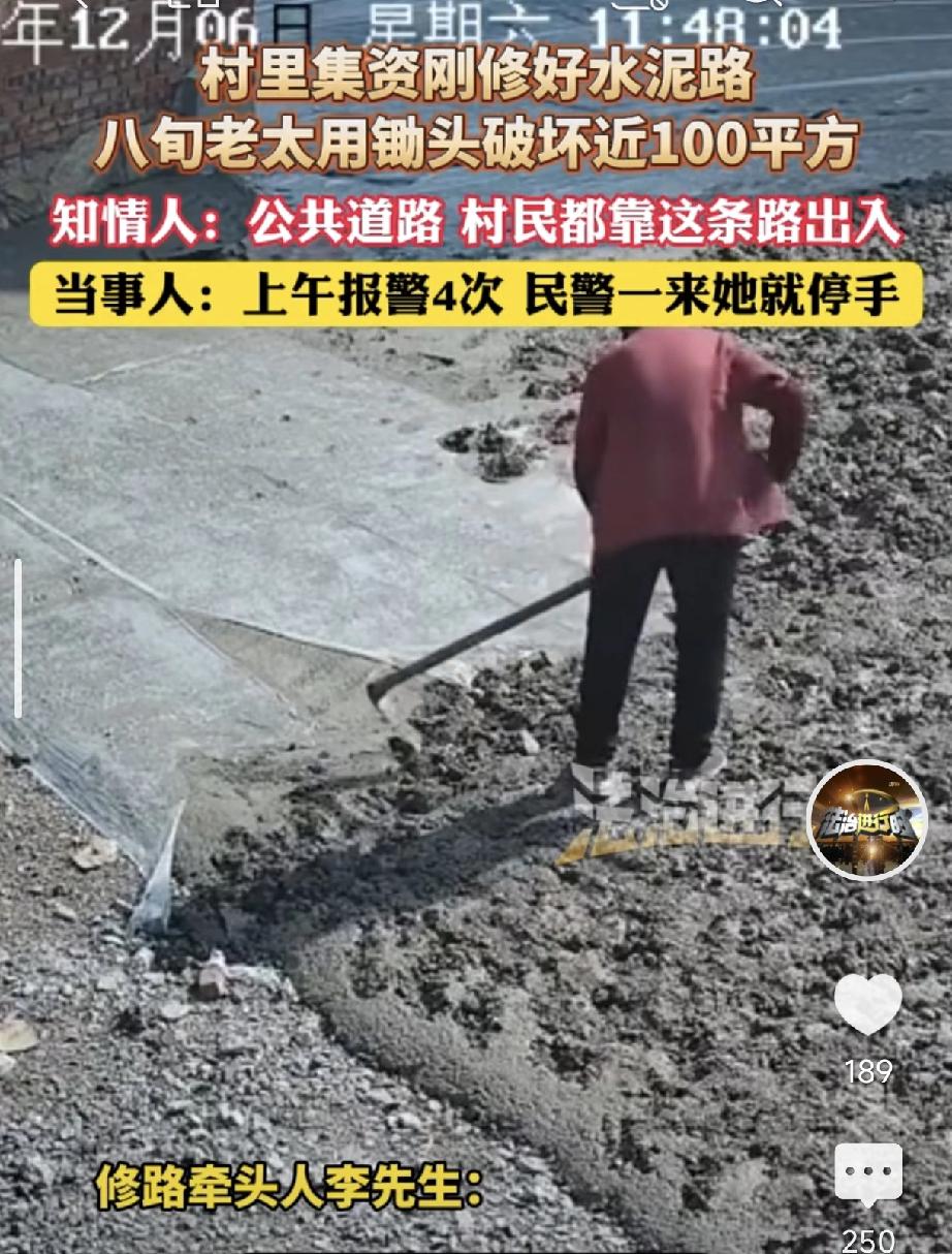 12月6日,湖南邵阳,村里集资硬化路面,水泥路刚平整好,老太太就拿锄头破坏,村民