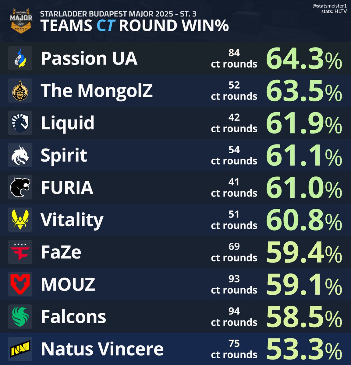 虎扑12月08日讯CS数据统计媒体报道,根据最新发布的“STARLADDERBUDAPESTMAJOR2025–ST.3”赛事数据统计,在CT方回合胜率(CTRoundWin%)榜单中,PassionUA与TheMongolZ表现最为突出。