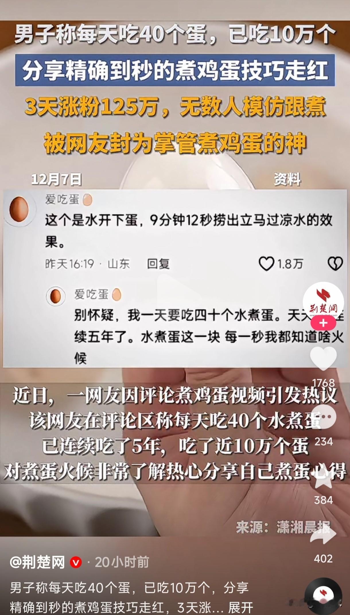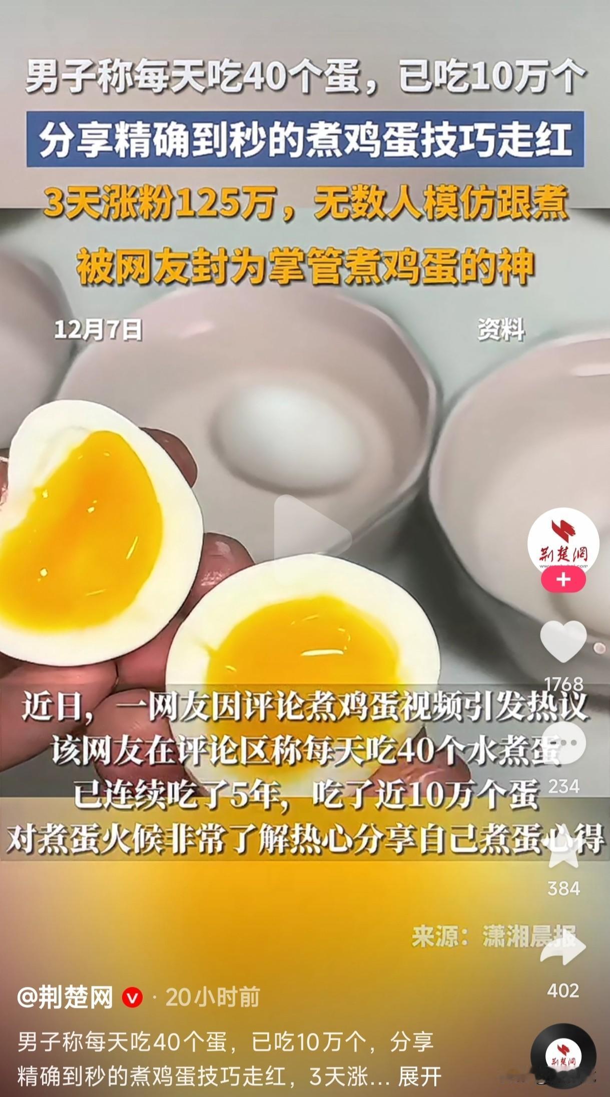 男子每天吃40个鸡蛋,连续5年吃了10万多个,分享精确到秒的煮鸡蛋技巧走红,3天涨粉125万,被网友封为掌管煮鸡蛋的神。 这每天吃鸡蛋的数量是不是可以申请世界吉尼斯纪录了?每天吃40个,已经连续吃了5年时间,吃了10万多个鸡蛋,难道他是每天就吃鸡蛋不吃其它的蔬菜米面吗?况且他煮鸡蛋的技巧更是惊人,开水下蛋9分12秒立马捞出过凉水,这看起来就是煮熟了外面的一层,里面的蛋黄不是生的吗?难不成这种半生半熟的鸡蛋吃起来有营养,而且吃多了对身体也没有什么危害吗? 他煮鸡蛋的技巧被无数网友模仿,而且他的网名也是爱吃蛋,更是被网友封为掌管煮鸡蛋的神,他的这种吃法和煮法是不是可以申请世界吉尼斯纪录了?