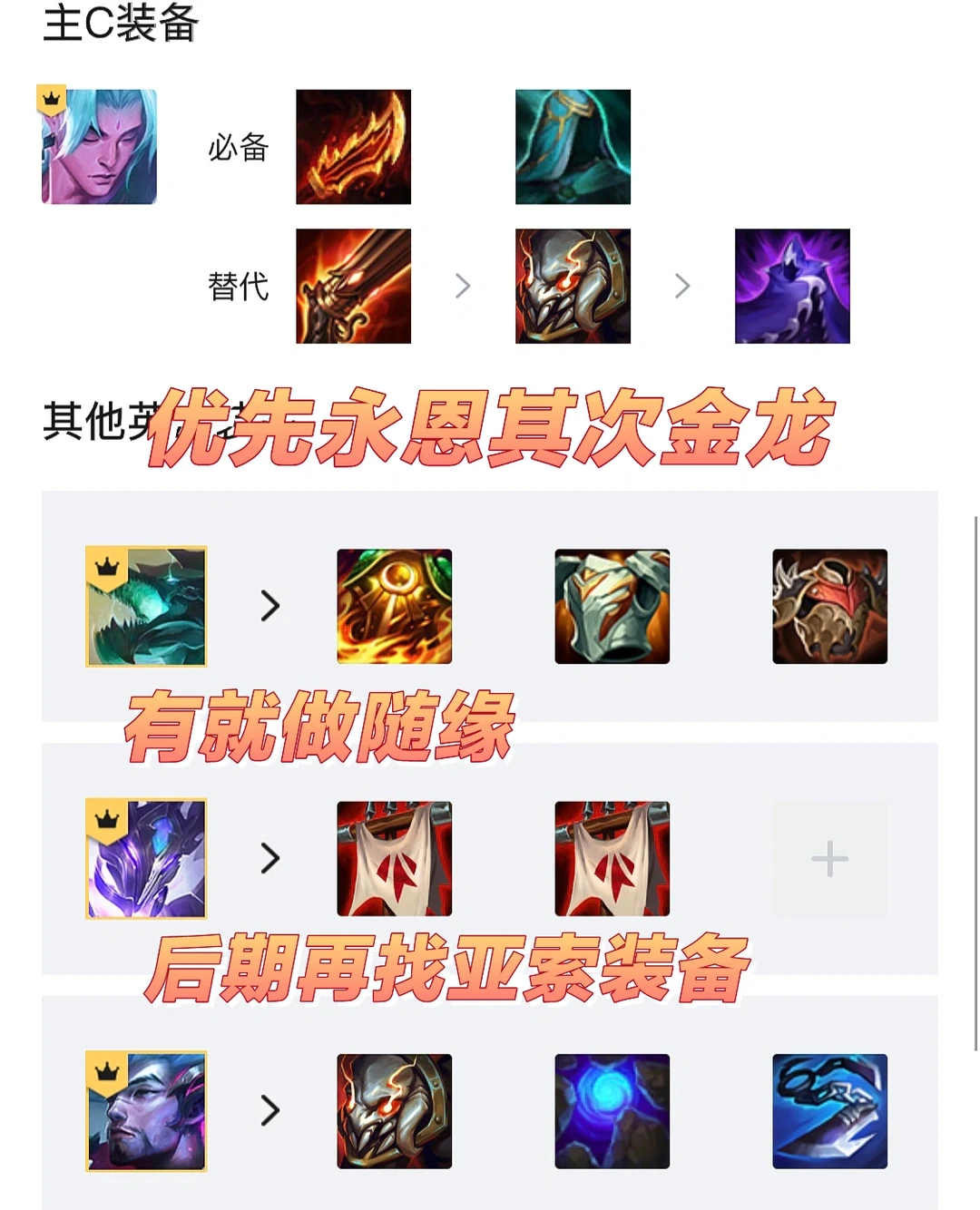 优先找永恩的三件套。然后是金龙的肉装,最后祭坛选秀再补亚索的装备,期间基克的聚合有条件合就直接合。