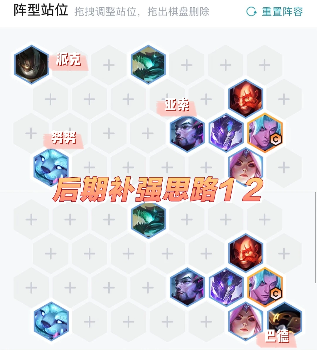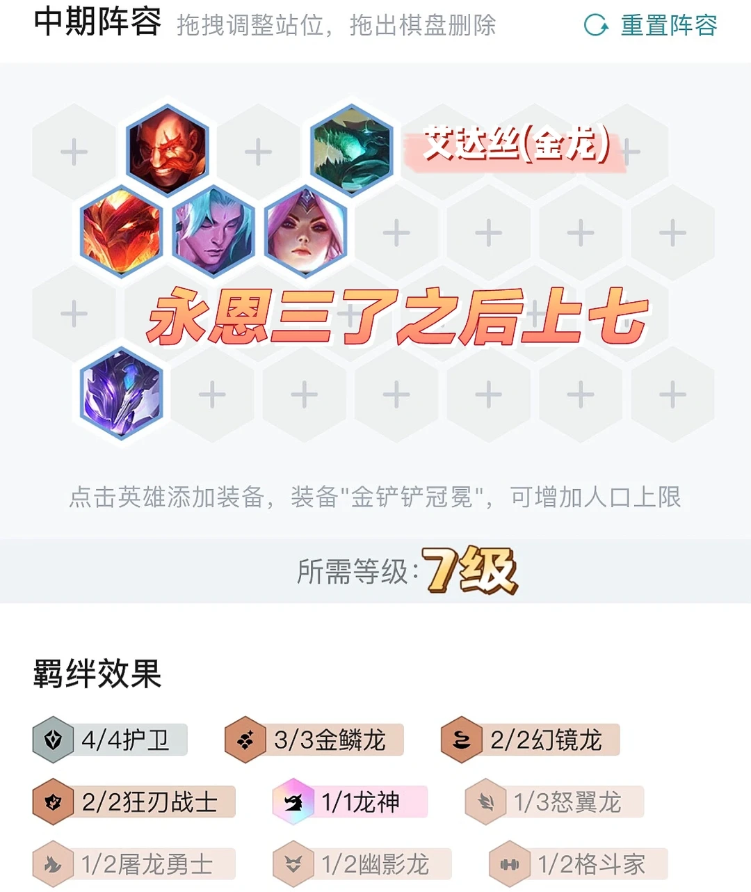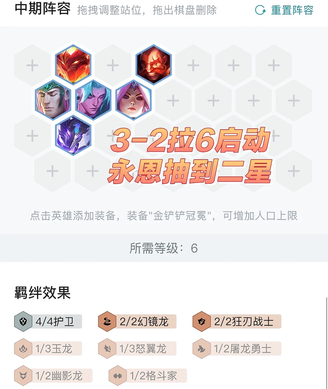 中期3-2拉6人口,把永恩抽到二星,然后存钱,然后3-4阶段慢D三星永恩之后上人口补齐阵容。