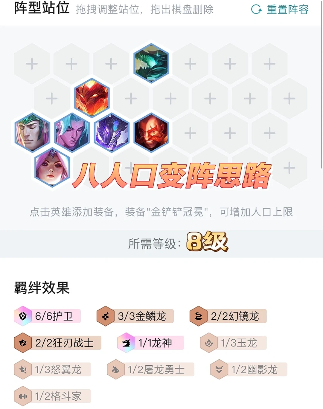 开局用护卫搭配2狂刃战士过渡,有护卫心可以开4护卫,基本前面是无敌的,没有则正常2护卫2狂刃带个斗士或者后排输出都行。
