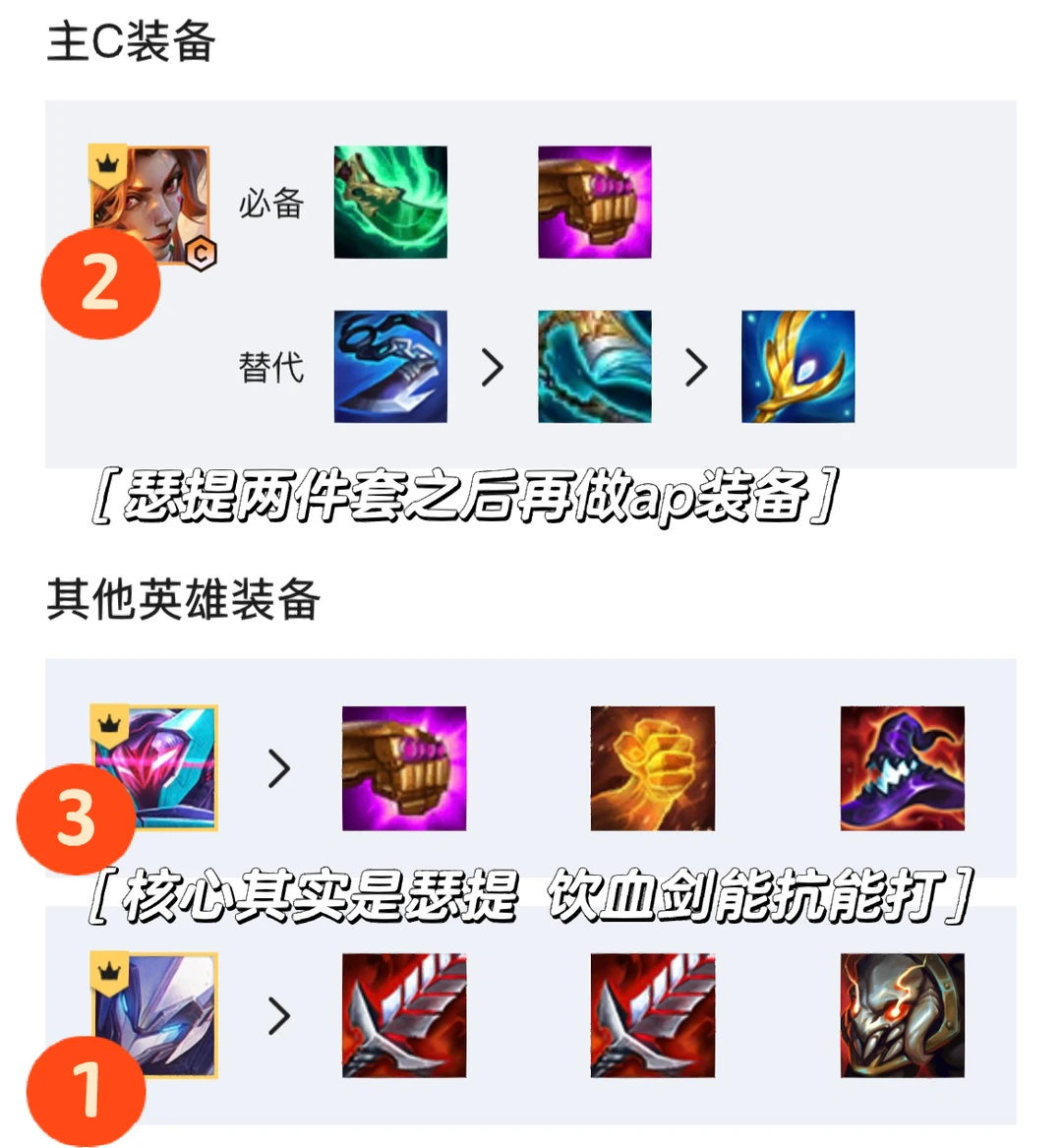 [草莓R]装备思路:优先找瑟提的饮血剑,两把最好,瑟提是阵容最核心的关键点,是不可替代的,有无装备的瑟提坦度天差地别,有两件套之后可以找AP装备了。