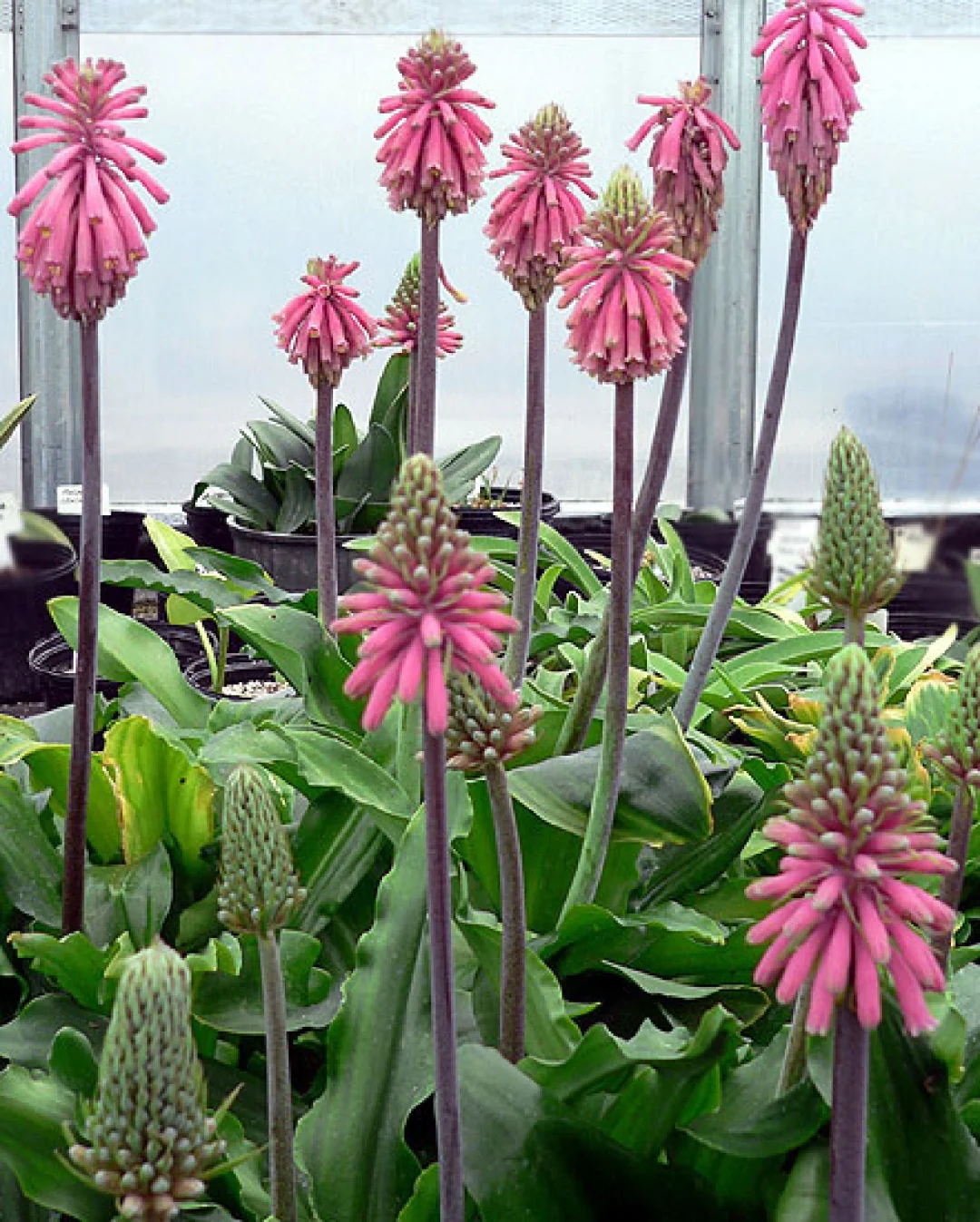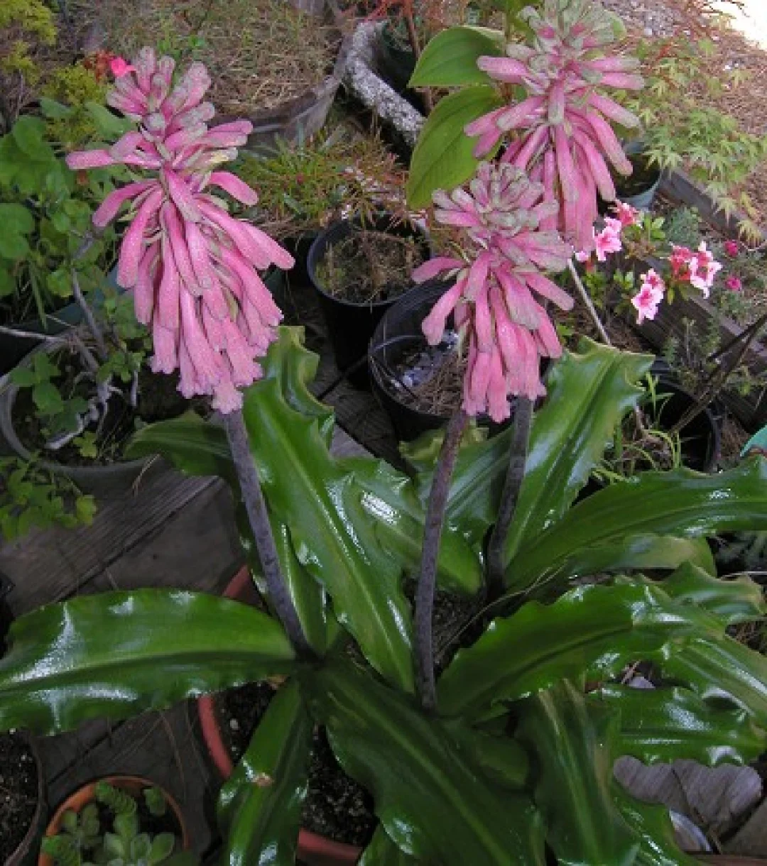 Veltheimia bracteata 半落叶球根植物它属于Veltheimia属,仅包含另一种Velthemia capensis。 它通常被称为森林百合,沙洋葱或红热扑克。这种下垂状植物的颜色从淡粉红色到红色不等。它是一种冬季开花的多年生植物,因此在其他花朵凋谢时会盛开。 具有美丽的,波浪形,有光泽的深绿色叶子和壮观的粉红色芦荟型花穗。 它需要半遮荫才能遮荫和排水良好的土壤。成群种植,制作壮观的展示。它们在容器中茁壮成长。还会出现罕见的黄色形式。